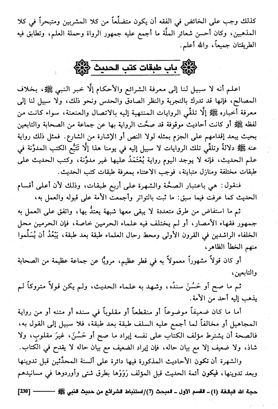 اعْلَم أَنه لَا سَبِيل لنا إِلَى معرفَة الشَّرَائِع وَالْأَحْكَام إِلَّا خبر النَّبِي صَلَّى اللهُ عَلَيْهِ وَسَلَّمَ بِخِلَاف الْمصَالح، فَإِنَّهَا قد تدْرك بالتجربة وَالنَّظَر الصَّادِق والحدس وَنَحْو ذَلِك، وَلَا سَبِيل لنا إِلَى معرفَة أخباره صَلَّى اللهُ عَلَيْهِ وَسَلَّمَ إِلَّا تلقي الرِّوَايَات المنتهية إِلَيْهِ بالاتصال والعنعنة سَوَاء كَانَت من لَفظه صَلَّى اللهُ عَلَيْهِ وَسَلَّمَ، أَو كَانَت أَحَادِيث مَوْقُوفَة قد صحت الرِّوَايَة بهَا عَن جمَاعَة من الصَّحَابَة وَالتَّابِعِينَ بِحَيْثُ يبعد إقدامهم على الْجَزْم بِمثلِهِ لَوْلَا النَّص أَو الاشارة من الشَّارِع، فَمثل ذَلِك رِوَايَة عَنهُ صَلَّى اللهُ عَلَيْهِ وَسَلَّمَ دلَالَة، وتلقي تِلْكَ الرِّوَايَات لَا سَبِيل إِلَيْهِ فِي يَوْمنَا هَذَا إِلَّا تتبع الْكتب الْمُدَوَّنَة فِي علم الحَدِيث، فَإِنَّهُ لَا يُوجد الْيَوْم رِوَايَة يعْتَمد عَلَيْهَا غير مدونة، وَكتب الحَدِيث على طَبَقَات مُخْتَلفَة ومنازل متباينة فَوَجَبَ الاعتناء بِمَعْرِِفَة طَبَقَات كتب الحَدِيث.