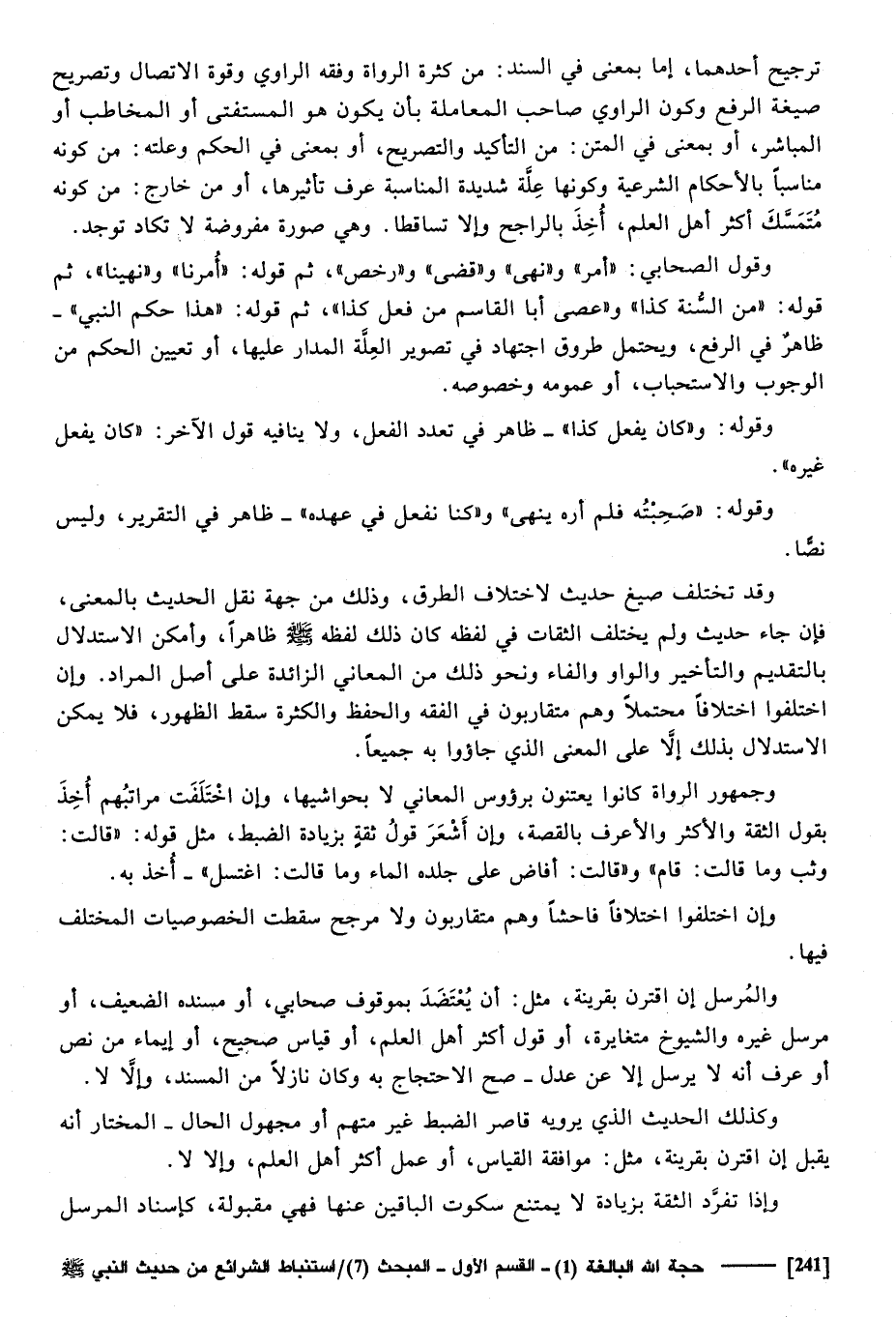وَقد تخْتَلف صِيغ حَدِيث لاخْتِلَاف الطّرق وَذَلِكَ من جِهَة نقل الحَدِيث بِالْمَعْنَى فَإِن جَاءَ حَدِيث وَلم يخْتَلف الثِّقَات فِي لَفظه كَانَ ذَلِك لَفظه صَلَّى اللهُ عَلَيْهِ وَسَلَّمَ ظَاهرا، وَأمكن الِاسْتِدْلَال بالتقديم وَالتَّأْخِير وَالْوَاو وَالْفَاء وَنَحْو ذَلِك من الْمعَانِي الزَّائِدَة على أصل المُرَاد، وَإِن اخْتلفُوا اخْتِلَافا مُحْتملا وهم متقاربون فِي الْفِقْه وَالْحِفْظ وَالْكَثْرَة سقط الظُّهُور، فَلَا يُمكن الِاسْتِدْلَال بذلك إِلَّا على الْمَعْنى جَاءُوا بِهِ جَمِيعًا، وَجُمْهُور الروَاة كَانُوا يعتنون برءوس الْمعَانِي لَا بحواشيها، وَإِن اخْتلفت مَرَاتِبهمْ أَخذ بقول الثِّقَة الَّذِي وَالْأَكْثَر والأعرف بالقصة، وَأَن أشعر قَول ثِقَة بِزِيَادَة الضَّبْط مثل قَوْله: قَالَت - وثب - وَمَا قَالَت - قَامَ - وَقَالَت - أَفَاضَ على جلده المَاء - وَمَا قَالَت - اغْتسل - أَخذ بِهِ، وَإِن اخْتلفُوا اخْتِلَافا فَاحِشا وهم متقاربون وَلَا مُرَجّح سَقَطت الخصوصيات الْمُخْتَلف فِيهَا.