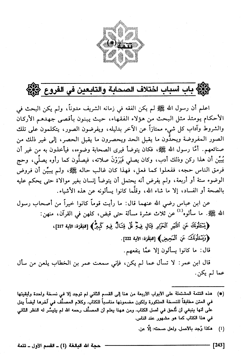 اعْلَم أَن رَسُول الله صَلَّى اللهُ عَلَيْهِ وَسَلَّمَ لم يكن الْفِقْه فِي زَمَانه الشريف مدونا، وَلم يكن الْبَحْث فِي الْأَحْكَام يَوْمئِذٍ مثل الْبَحْث من هَؤُلَاءِ الْفُقَهَاء حَيْثُ يبنون بأقصى جهدهمْ الْأَركان والشروط، وآداب كل شَيْء ممتازا عَن الآخر بدليله، ويفرضون الصُّور يَتَكَلَّمُونَ على تِلْكَ الصُّور الْمَفْرُوضَة،