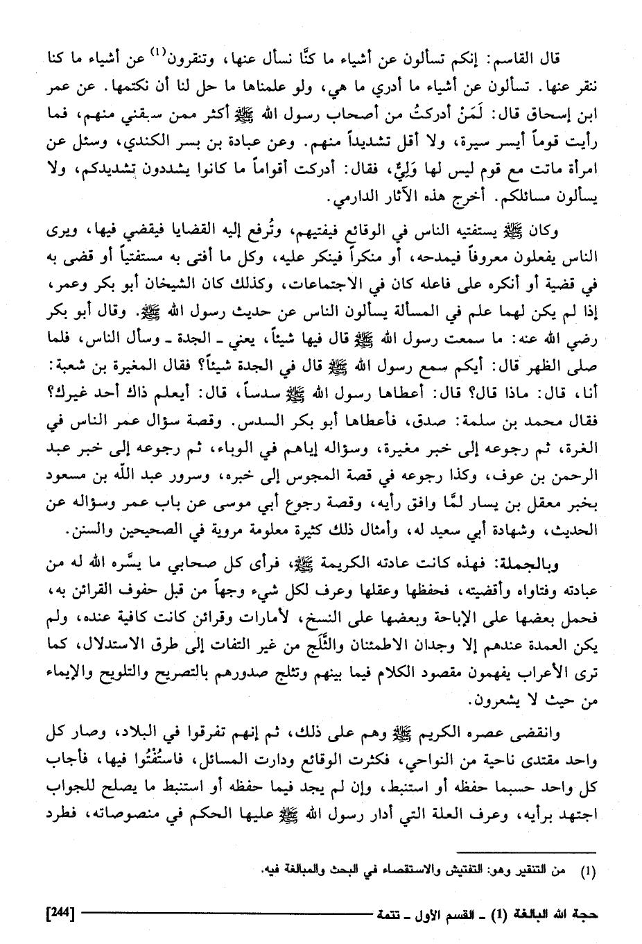 وَبِالْجُمْلَةِ فَهَذِهِ كَانَت عَادَته الْكَرِيمَة صَلَّى اللهُ عَلَيْهِ وَسَلَّمَ، فَرَأى كل صَحَابِيّ مَا يسره الله لَهُ من عِبَادَته وفتاواه وأقضيته، فحفظها، وعقلها، وَعرف لكل شَيْء وَجها من قبل حفوف الْقَرَائِن بِهِ، فَحمل بَعْضهَا على الْإِبَاحَة، وَبَعضهَا على النّسخ لأمارات وقرائن كَانَت كَافِيَة عِنْده، وَلم يكن الْعُمْدَة عِنْدهم إِلَّا وجدان الاطمئنان والثلج من غير الْتِفَات إِلَى طرق الِاسْتِدْلَال كَمَا ترى الْأَعْرَاب يفهمون مَقْصُود الْكَلَام فِيمَا بَينهم، وتثلج صُدُورهمْ بالتصريح والتلويح والإيماء من حَيْثُ لَا يَشْعُرُونَ، فانقضى عصره الْكَرِيم وهم على ذَلِك، ثمَّ إِنَّهُم تفَرقُوا فِي الْبِلَاد وَصَارَ كل وَاحِد مقتدى نَاحيَة من النواحي،