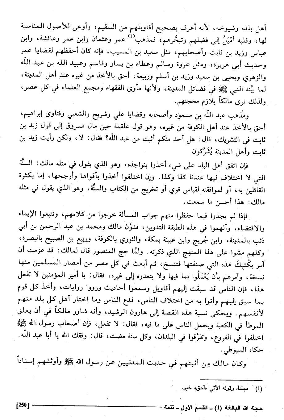 أهل بَلَده وشيوخه لِأَنَّهُ أعرف بِصَحِيح أقاويلهم عَن السقيم وأوعى للاصوال الْمُنَاسبَة لَهَا وَقَلبه أميل إِلَى فَضلهمْ وتبحرهم فمذهب عمر وَعُثْمَان وَابْن عمر وَعَائِشَة وَابْن عَبَّاس وَزيد بن ثَابت، وأصحابهم مثل سعيد بن الْمسيب فَإِنَّهُ كَانَ أحفظهم لقضايا عمر، وَحَدِيث أبي هُرَيْرَة، وَمثل عُرْوَة وَسَالم وَعَطَاء بن يسَار وقاسم وَعبيد الله وَابْن عبد الله وَالزهْرِيّ، وَيحيى بن سعيد وَزيد بن أسلم وَرَبِيعَة - أَحَق بِالْأَخْذِ من غَيره عِنْد أهل الْمَدِينَة لما بَينه النَّبِي صَلَّى اللهُ عَلَيْهِ وَسَلَّمَ فِي فَضَائِل الْمَدِينَة، وَلِأَنَّهَا مأوى الْفُقَهَاء وَمجمع الْعلمَاء فِي كل عصر، وَلذَلِك ترى مَالِكًا يلازم محجتهم، وَمذهب عبد الله بن مَسْعُود وَأَصْحَابه، وقضايا على وَشُرَيْح وَالشعْبِيّ وفتاوى إِبْرَاهِيم، - أَحَق بِالْأَخْذِ عَن أهل الْكُوفَة من غَيره وَهُوَ قَول عَلْقَمَة حِين مَال مَسْرُوق إِلَى قَول زيد بن ثَابت فِي التَّشْرِيك قَالَ: هَل أحد مِنْكُم أثبت من عبد الله؟ فَقَالَ لَا وَلَكِن رَأَيْت زيد بن ثَابت وَأهل الْمَدِينَة يشركُونَ، فَإِن اتّفق أهل الْبَلَد على شَيْء أخذُوا بنواجذه، وَهُوَ الَّذِي يَقُول فِي مثله مَالك: السّنة الَّتِي لَا اخْتِلَاف فِيهَا عندنَا كَذَا وَكَذَا، وَإِن اخْتلفُوا أخذُوا بأقواها وأرجحها إِمَّا بِكَثْرَة الْقَائِلين بِهِ أَو لموافقته لقياس قوي، أَو تَخْرِيج من الْكتاب وَالسّنة، وَهُوَ الَّذِي يَقُول فِي مثله مَالك: هَذَا أحسن مَا سَمِعت، فَإِذا لم يَجدوا فِيمَا حفظوا مِنْهُم جَوَاب الْمَسْأَلَة خَرجُوا من كَلَامهم، وتتبعوا الْإِيمَاء والاقتضاء، وألهموا فِي هَذِه الطَّبَقَة التدوين، فدون مَالك وَمُحَمّد بن عبد الرَّحْمَن بن أبي ذِئْب بِالْمَدِينَةِ، وَابْن جريج وَابْن عُيَيْنَة بِمَكَّة، وَالثَّوْري بِالْكُوفَةِ، وربيع بن صبيح بِالْبَصْرَةِ. وَكلهمْ مَشوا على هَذَا الْمنْهَج الَّذِي ذكرته، وَلما حج الْمَنْصُور قَالَ لمَالِك: قد عزمت أَن أَمر بكتبك هَذِه