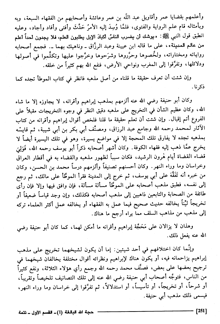 مَا قُلْنَا فلخص أَقْوَال إِبْرَاهِيم وأقرانه من كتاب الْآثَار لمُحَمد رَحمَه الله وجامع عبد الرَّزَّاق ومصنف أَبُو بكر بن أبي شيبَة، ثمَّ قايسه بمذهبه تَجدهُ لَا يُفَارق تِلْكَ المحجة إِلَّا فِي مَوَاضِع يسيرَة وَهُوَ فِي تِلْكَ الْيَسِيرَة أَيْضا لَا يخرج عَمَّا ذهب إِلَيْهِ فُقَهَاء الْكُوفَة، وَكَانَ أشهر أَصْحَابه ذكرا أَبُو يُوسُف رَحمَه الله، فولى قَضَاء الْقُضَاة أَيَّام هَارُون الرشيد، فَكَانَ سَببا لظُهُور مذْهبه وَالْقَضَاء بِهِ فِي أقطار الْعرَاق وخراسان وَمَا وَرَاء النَّهر، وَكَانَ أحْسنهم تصنيفا وألزمهم درسا مُحَمَّد بن الْحسن، وَكَانَ من خَبره أَنه تفقه على أبي يُوسُف، ثمَّ خرج، إِلَى الْمَدِينَة، فَقَرَأَ الْمُوَطَّأ على مَالك، ثمَّ رَجَعَ إِلَى نَفسه، فطبق مَذْهَب أَصْحَابه على الْمُوَطَّأ مَسْأَلَة مَسْأَلَة فَإِن وَافق فِيهَا وَإِلَّا فَإِن رأى طَائِفَة من الصَّحَابَة وَالتَّابِعِينَ ذَاهِبين إِلَى مَذْهَب أَصْحَابه فَكَذَلِك، وَإِن وجد قِيَاسا ضَعِيفا أَو تخريجا لينًا يُخَالِفهُ حَدِيث صَحِيح فِيمَا عمل بِهِ الْفُقَهَاء أَو يُخَالِفهُ عمل أَكثر الْعلمَاء - تَركه إِلَى مَذْهَب من مَذَاهِب السّلف مِمَّا يرَاهُ أرجح مَا هُنَاكَ، وَهَذَانِ لَا يزَالَانِ على محجة إِبْرَاهِيم وأقرانه مَا أمكن لَهما كَمَا كَانَ أَبُو حنيفَة رَضِي الله عَنهُ يفعل ذَلِك.