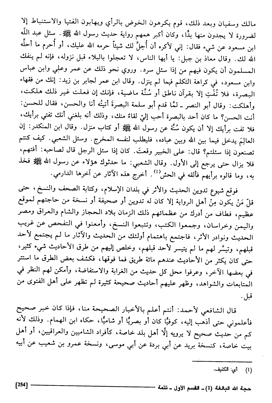 نُزُوله، فَإِنَّهُ لم يَنْفَكّ الْمُسلمُونَ أَن يكون فيهم من إِذا سُئِلَ سرد، وَرُوِيَ نَحْو ذَلِك عَن عمر وَعلي وَابْن عَبَّاس وَابْن مَسْعُود فِي كَرَاهَة التَّكَلُّم فِيمَا لم ينزل. وَقَالَ ابْن عمر لجَابِر بن زيد: إِنَّك من فُقَهَاء الْبَصْرَة، فَلَا تفت إِلَّا بقرآن نَاطِق أَو سنة مَاضِيَة، فَإنَّك إِن فعلت غير ذَلِك هَلَكت، وأهلكت وَقَالَ أَبُو النَّصْر - لما قدم أَبُو سَلمَة الْبَصْرَة - أَتَيْته أَنا وَالْحسن فَقَالَ لِلْحسنِ: أَنْت الْحسن؟ مَا كَانَ أحد بِالْبَصْرَةِ أحب إِلَى لِقَاء مِنْك، وَذَلِكَ أَنه بَلغنِي أَنَّك تُفْتِي بِرَأْيِك، فَلَا تفت بِرَأْيِك إِلَّا أَن يكون سنة عَن رَسُول الله صَلَّى اللهُ عَلَيْهِ وَسَلَّمَ أَو كتاب منزل. وَقَالَ ابْن الْمُنْكَدر: إِن الْعَالم يدْخل فِيمَا بَين الله وَبَين عباده، فليطلب لنَفسِهِ الْمخْرج. وَسُئِلَ الشّعبِيّ. كَيفَ كُنْتُم تَصْنَعُونَ إِذا سئلتم؟ قَالَ: على الْخَبِير وَقعت كَانَ إِذا سُئِلَ الرجل قَالَ لصَاحبه: أفتهم، فَلَا يزَال حَتَّى يرجع إِلَى الأول، وَقَالَ الشّعبِيّ: مَا حدثوك هَؤُلَاءِ عَن رَسُول الله صَلَّى اللهُ عَلَيْهِ وَسَلَّمَ فَخذ بِهِ، وَمَا قَالُوهُ برأيهم، فألقه فِي الحش أخرج هَذِه الْآثَار عَن آخرهَا الدَّارمِيّ، فَوَقع شيوع تدوين الحَدِيث والأثر فِي بلدان الْإِسْلَام، وَكِتَابَة الصُّحُف والنسخ حَتَّى قل من يكون أهل الرِّوَايَة إِلَّا كَانَ لَهُ تدوين أَو صحيفَة أَو نُسْخَة من حَاجتهم لموقع عَظِيم، فَطَافَ من أدْرك من عظمائهم ذَلِك الزَّمَان بِلَاد الْحجاز وَالشَّام وَالْعراق، ومصر واليمن وخراسان، وجمعوا الْكتب، وتتبعوا النّسخ، وأمعنوا فِي التفحص عَن غَرِيب الحَدِيث ونوادر الْأَثر، فَاجْتمع باهتمام أُولَئِكَ من الحَدِيث والْآثَار مَا لم يجْتَمع لأحد قبلهم، وتيسر لَهُم مَا لم يَتَيَسَّر لأحد قبلهم، وخلص إِلَيْهِم من طرق الْأَحَادِيث شَيْء كثير حَتَّى كَانَ يكثر من الْأَحَادِيث عِنْدهم مائَة طَرِيق فَمَا فَوْقهَا، فكشف بعض الطّرق مَا استتر فِي بَعْضهَا الآخر، وَعرفُوا مَحل كل حَدِيث من الغرابة والاستفاضة، وَأمكن لَهُم النّظر فِي المتابعات والشواهد، وَظهر عَلَيْهِم أَحَادِيث صَحِيحَة