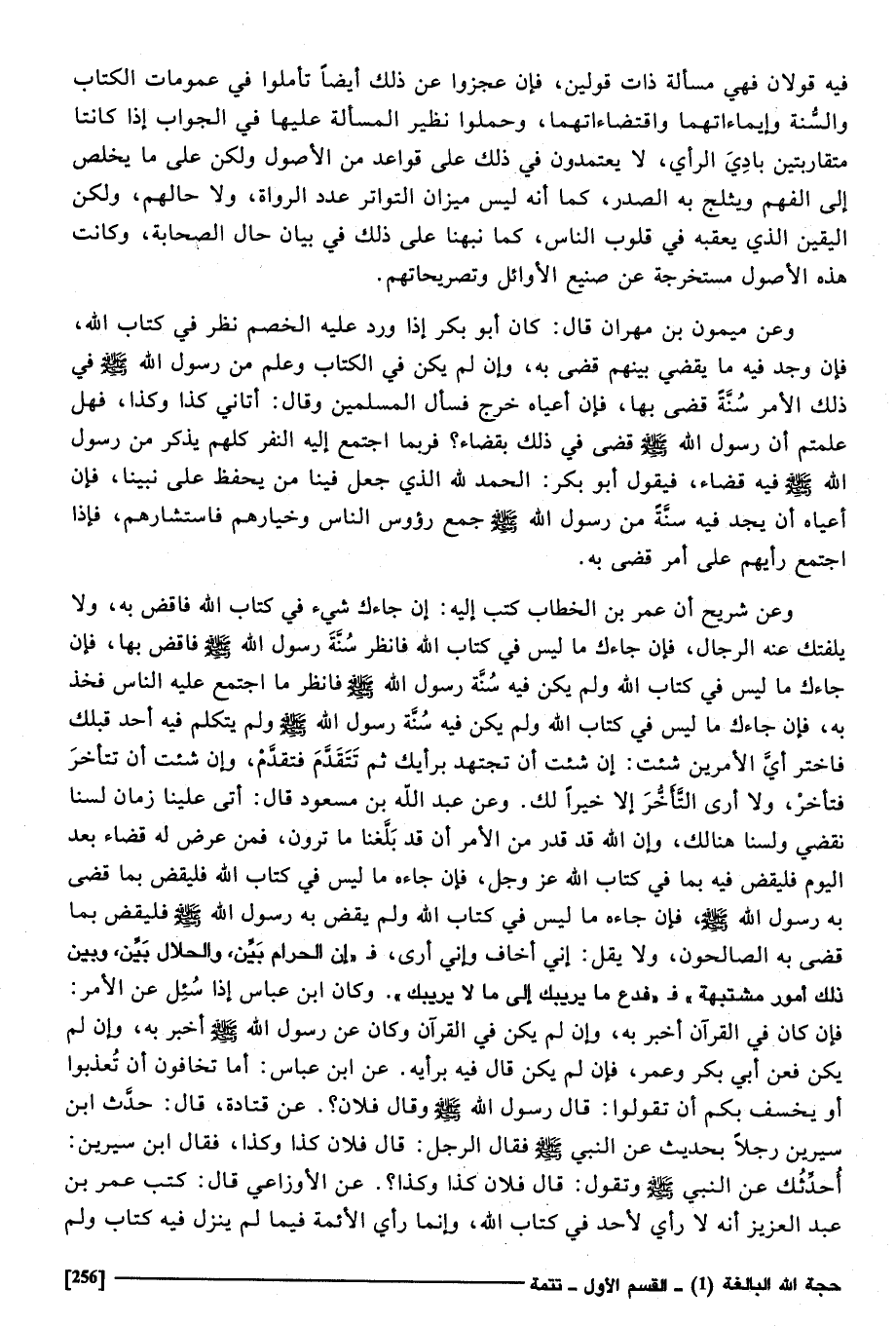وَعَن شُرَيْح أَن عمر بن الْخطاب كتب إِلَيْهِ إِن جَاءَك شَيْء فِي كتاب الله فَاقْض بِهِ، وَلَا يلفتك عَنهُ الرِّجَال، فَإِن جَاءَك مَا لَيْسَ فِي كتاب الله، فَانْظُر سنة رَسُول الله صَلَّى اللهُ عَلَيْهِ وَسَلَّمَ، فَاقْض بهَا، فَإِن جَاءَك مَا لَيْسَ فِي كتاب الله، وَلم يكن فِي سنة رَسُول الله صَلَّى اللهُ عَلَيْهِ وَسَلَّمَ، فَانْظُر مَا اجْتمع عَلَيْهِ النَّاس، فَخذ بِهِ، فَإِن جَاءَك مَا لَيْسَ فِي كتاب الله، وَلم يكن فِي سنة رَسُول الله صَلَّى اللهُ عَلَيْهِ وَسَلَّمَ، وَلم يتَكَلَّم فِيهِ أحد قبلك، فاختر أَي الْأَمريْنِ شِئْت إِن شِئْت أَن تجتهد بِرَأْيِك، ثمَّ تقدم، فَتقدم، وَإِن شِئْت أَن تتأخر، فَتَأَخر وَلَا أرى التَّأَخُّر إِلَّا خيرا لَك، وَعَن عبد الله بن مَسْعُود قَالَ: أَتَى علينا زمَان لسنا نقضي ولسنا هُنَالك، وَإِن الله قد قدر من الْأَمر أَن قد بلغنَا مَا ترَوْنَ، فَمن عرض لَهُ قَضَاء بعد الْيَوْم فليقض فِيهِ بِمَا فِي كتاب الله عز وَجل، فَإِن جَاءَهُ مَا لَيْسَ فِي كتاب الله فليقضى بِمَا قضى بِهِ رَسُول الله صَلَّى اللهُ عَلَيْهِ وَسَلَّمَ، فَإِن جَاءَك مَا لَيْسَ فِي كتاب الله، وَلم يقْض بِهِ رَسُول الله صَلَّى اللهُ عَلَيْهِ وَسَلَّمَ فليقض بِمَا قضى بِهِ الصالحون وَلَا يقل إِنِّي أَخَاف وَأَنِّي أرى " فَإِن الْحَرَام بَين، والحلال بَين، وَبَين ذَلِك أُمُور مشتبهة، فدع مَا يريبك إِلَى مَا لَا يريبك " وَكَانَ ابْن عَبَّاس إِذا سُئِلَ عَن الْأَمر فَإِن كَانَ فِي الْقُرْآن أخبر بِهِ، وَإِن لم يكن فِي الْقُرْآن وَكَانَ عَن رَسُول الله صَلَّى اللهُ عَلَيْهِ وَسَلَّمَ أخبر بِهِ