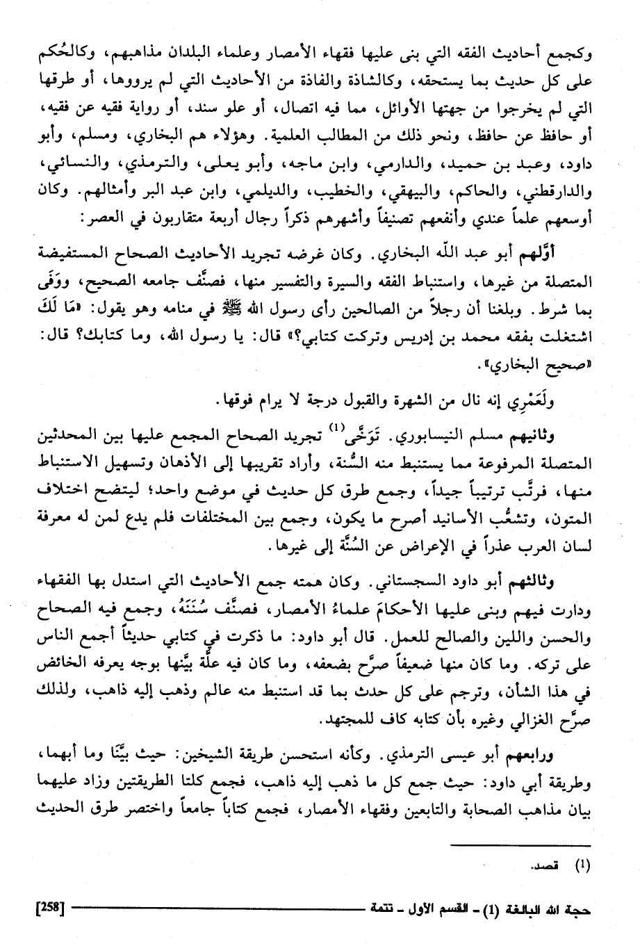 أَوَّلهمْ أَبُو عبد الله البُخَارِيّ وَكَانَ غَرَضه تَجْرِيد الْأَحَادِيث الصِّحَاح المستفيضة الْمُتَّصِلَة من غَيرهَا، واستنباط الْفِقْه والسيرة وَالتَّفْسِير مِنْهَا، فصنف جَامعه الصَّحِيح، ووفى بِمَا شَرط، وبلغنا أَن رجل من الصَّالِحين رأى رَسُول صَلَّى اللهُ عَلَيْهِ وَسَلَّمَ فِي مَنَامه وَهُوَ يَقُول: مَالك اشتغلت بِفقه مُحَمَّد بن إِدْرِيس وَتركت كتابي، قَالَ: يَا رَسُول الله وَمَا كتابك؟ قَالَ: صَحِيح البُخَارِيّ ولعمري أَنه نَالَ من الشُّهْرَة وَالْقَبُول دَرَجَة لَا يرام فَوْقهَا.