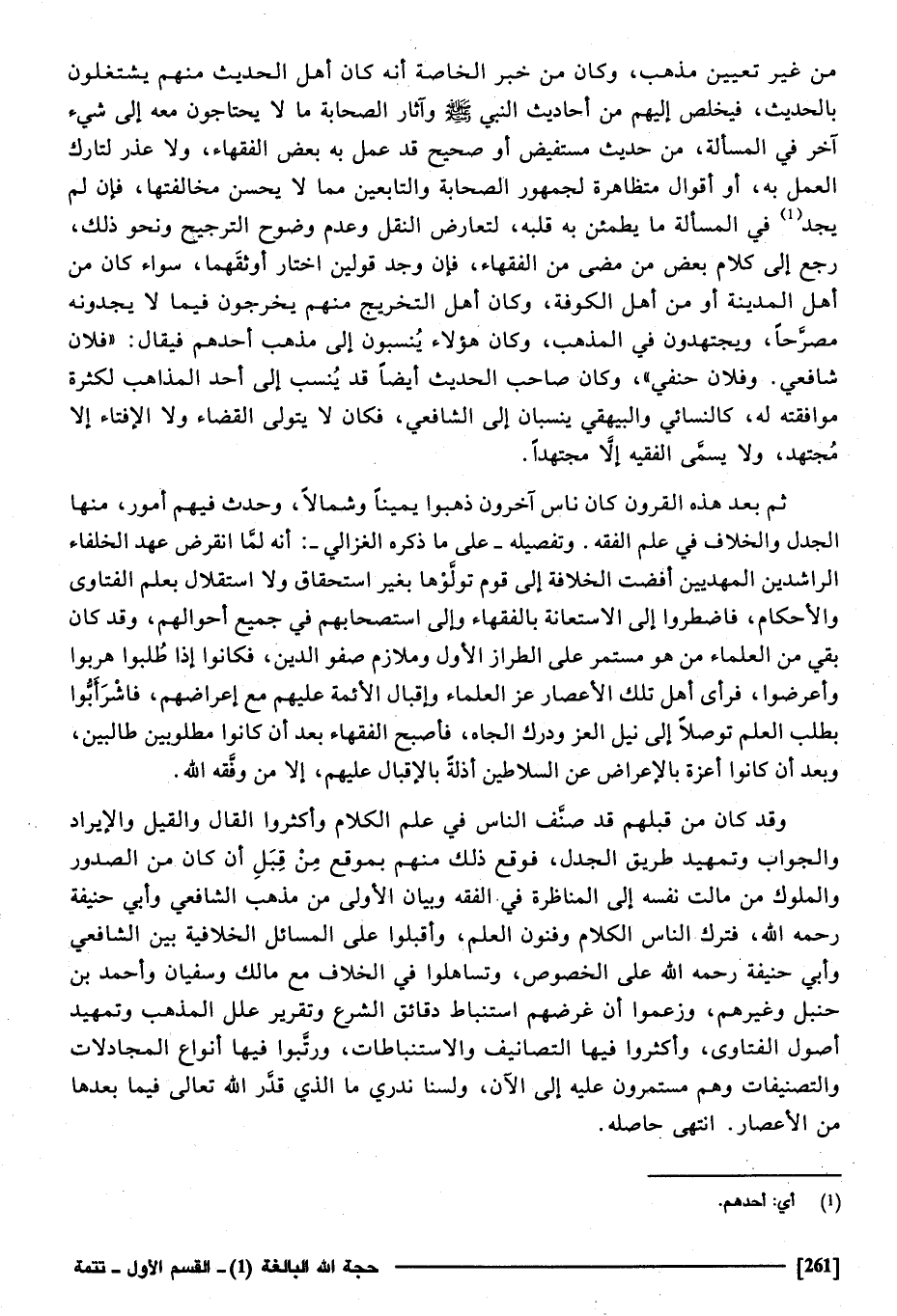 الأولى من مَذْهَب الشَّافِعِي وَأبي حنيفَة رَحمَه الله، فَترك النَّاس الْكَلَام وفنون الْعلم، وَأَقْبلُوا على الْمسَائِل الخلافية بَين الشَّافِعِي وَأبي حنيفَة رَحمَه الله على الْخُصُوص، وتساهلوا فِي الْخلاف مَعَ مَالك وسُفْيَان وَأحمد بن حَنْبَل وَغَيرهم، وَزَعَمُوا أَن غرضهم استنباط دقائق الشَّرْع وَتَقْدِير علل الْمَذْهَب وتمهيد أصُول الْفَتَاوَى، وَأَكْثرُوا فِيهَا التصانيف والاستنباطات، ورتبوا فِيهَا أَنْوَاع المجادلات والتصنيفات وهم مستمرون عَلَيْهِ إِلَى الْآن لسنا نَدْرِي مَا الَّذِي قدر الله تَعَالَى فِيمَا بعْدهَا من الْأَعْصَار انْتهى حَاصله.