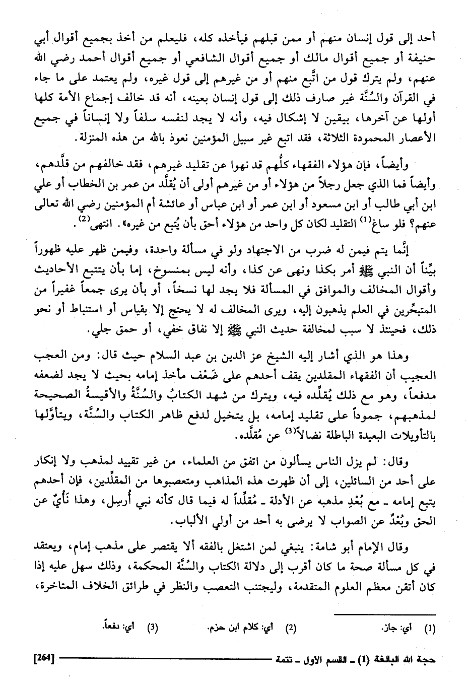 وَأَيْضًا فَإِن هَؤُلَاءِ الْفُقَهَاء كلهم قد نهوا عَن تَقْلِيد غَيرهم، فقد خالفهم من قلدهم، وَأَيْضًا فَمَا الَّذِي جعل رجلا من هَؤُلَاءِ أَو من غَيرهم أولى أَن يُقَلّد من عمر بن الْخطاب أَو عَليّ بن أبي طَالب أَو ابْن مَسْعُود أَو ابْن عمر أَو ابْن عَبَّاس أَو عَائِشَة أم الْمُؤمنِينَ رَضِي الله تَعَالَى عَنْهُم، فَلَو سَاغَ التَّقْلِيد لَكَانَ كل وَاحِد من هَؤُلَاءِ أَحَق بِأَن يتبع من غَيره انْتهى، إِنَّمَا يتم فِيمَن لَهُ ضرب من الِاجْتِهَاد وَلَو فِي مَسْأَلَة وَاحِدَة، وفيمن ظهر عَلَيْهِ ظهورا بَيْننَا أَن النَّبِي صَلَّى اللهُ عَلَيْهِ وَسَلَّمَ أَمر بِكَذَا، وَنهى عَن كَذَا، وَأَنه لَيْسَ بمنسوخ إِمَّا بِأَن يتتبع الْأَحَادِيث وأقوال الْمُخَالف والموافق فِي الْمَسْأَلَة، فَلَا يجد لَهَا نسخا، أَو بِأَن يرى جمعا غفيرا من المتبحرين فِي الْعلم يذهبون إِلَيْهِ، وَيرى الْمُخَالف لَهُ لَا يحْتَج إِلَّا بِقِيَاس أَو استنباط أَو نَحْو ذَلِك، فَحِينَئِذٍ لَا سَبَب لمُخَالفَة حَدِيث النَّبِي صَلَّى اللهُ عَلَيْهِ وَسَلَّمَ إِلَّا نفاق خَفِي، أَو حمق جلي.