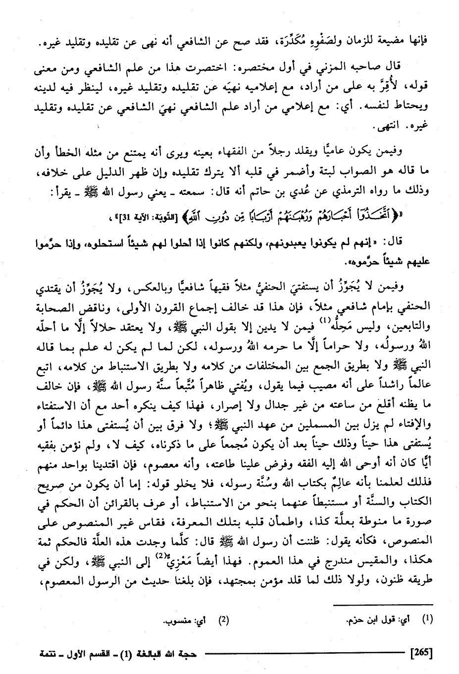 قَالَ: " إِنَّهُم لم يَكُونُوا يَعْبُدُونَهُمْ، وَلَكنهُمْ كَانُوا إِذا أحلُّوا لَهُم شَيْئا اسْتَحَلُّوهُ، وَإِذا حرمُوهُ عَلَيْهِم شَيْئا محرما " ... ، وفيمن لَا يجوز أَن يستفتي الْحَنَفِيّ مثلا فَقِيها شافعيا وَبِالْعَكْسِ، وَلَا يجوز أَن يَقْتَدِي الْحَنَفِيّ بِإِمَام شَافِعِيّ مثلا، فَإِن هَذَا قد إِجْمَال الْقُرُون الأولى، وناقض الصَّحَابَة وَالتَّابِعِينَ وَلَيْسَ محلّة فِيمَن لَا يدين إِلَّا بقول النَّبِي صَلَّى اللهُ عَلَيْهِ وَسَلَّمَ، وَلَا يعْتَقد حَلَالا إِلَّا مَا أحله الله وَرَسُوله، وَلَا حَرَامًا إِلَّا مَا حرمه الله وَرَسُوله، لَكِن لما لم يكن لَهُ علم بِمَا قَالَه النَّبِي صَلَّى اللهُ عَلَيْهِ وَسَلَّمَ وَلَا بطرِيق الْجمع بَين المختلفات من كَلَامه، وَلَا بطرِيق الاستنباط من كَلَامه اتبع عَالما راشدا على أَنه مُصِيب فِيمَا يَقُول، ويفتي ظَاهرا مُتبع سنة رَسُول الله صَلَّى اللهُ عَلَيْهِ وَسَلَّمَ فَإِن خَالف مَا يَظُنّهُ أقلع من سَاعَته من غير جِدَال وَلَا إِصْرَار، فَهَذَا كَيفَ يُنكره أحد مَعَ أَن الاستفتاء والافتاء لم يزل بَين الْمُسلمين من عهد النَّبِي صَلَّى اللهُ عَلَيْهِ وَسَلَّمَ؛ وَلَا فرق بَين أَن يستفتي هَذَا دَائِما، أَو يستفتى هَذَا حينا وَذَلِكَ حينا بعد أَن يكون مجمعا على مَا ذَكرْنَاهُ، كَيفَ لَا وَلم نؤمن بفقيه أيا كَانَ أَنه أوحى الله إِلَيْهِ الْفِقْه، وَفرض علينا طَاعَته، وَأَنه معصومة، فَإِن اقتدينا بِوَاحِد مِنْهُم فَذَلِك لعلمنا بِأَنَّهُ عَالم بِكِتَاب الله وَسنة رَسُوله، فَلَا يخلوا قَوْله إِمَّا أَن يكون من صَرِيح الْكتاب وَالسّنة، أَو مستنبطا عَنْهُمَا بِنَحْوِ من الاستنباط، أَو عرف بالقرائن أَن الحكم فِي صُورَة مَا منوطة بعلة كَذَا، وَاطْمَأَنَّ قلبه بِتِلْكَ الْمعرفَة، فقاس غير الْمَنْصُوص على الْمَنْصُوص، فَكَأَنَّهُ يَقُول: ظَنَنْت