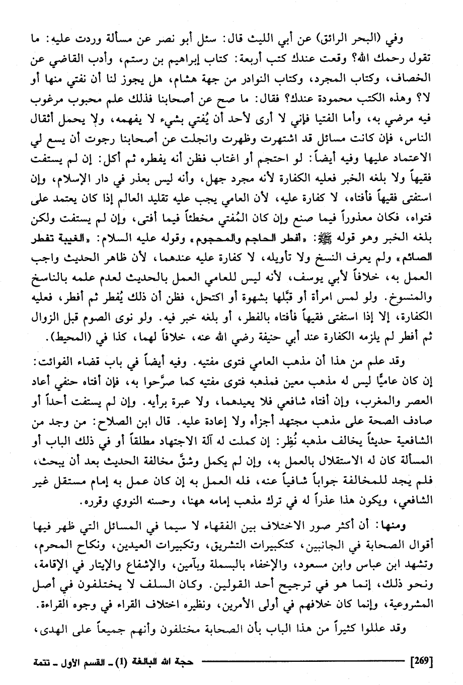 وَفِي الْبَحْر الرَّائِق عَن أبي اللَّيْث قَالَ: سُئِلَ أَبُو نصر عَن مَسْأَلَة وَردت عَلَيْهِ مَا تَقول رَحِمك الله وَقعت عنْدك كتب أَرْبَعَة، كتاب إِبْرَاهِيم بن رستم، وأدب القَاضِي من الْخصاف، وَكتاب الْمُجَرّد، وَكتاب النَّوَادِر من جِهَة هِشَام هَل يجوز لنا أَن نفتي مِنْهَا أَولا، وَهَذِه الْكتب محمودة عنْدك؟ فَقَالَ مَا صَحَّ عَن أَصْحَابنَا فَذَلِك علم مَحْبُوب مَرْغُوب بِهِ مرضِي عَنهُ، وَأما الْفتيا فَإِنِّي لَا أرى لأحد أَن يُفْتِي بِشَيْء لَا يفهمهُ، وَلَا يحمل أثقال النَّاس، فَإِن كَانَت مسَائِل قد اشتهرت، وَظَهَرت، وانجلت عَن أَصْحَابنَا رَجَوْت أَن يسع لي الِاعْتِمَاد عَلَيْهَا، وَفِيه أَيْضا لَو احتجتم أَو أغتاب فَظن أَنه يفطره، ثمَّ أكل إِن لم يستفت فَقِيها وَلَا بلغَة الْخَبَر، فَعَلَيهِ الْكَفَّارَة لِأَنَّهُ مُجَرّد جهل، وَأَنه لَيْسَ بِعُذْر فِي دَار الْإِسْلَام، وَإِن استفتى فَقِيها، فأفتاه لَا كَفَّارَة عَلَيْهِ لِأَن الْعَاميّ يجب عَلَيْهِ تَقْلِيد الْعَالم إِذا كَانَ يعْتَمد على فتواه، فَكَانَ مَعْذُورًا فِيمَا صنع، وَإِن كَانَ الْمُفْتِي مخطئا فِيمَا أفتى، وَإِن لم يستفت وَلَكِن بلغه الْخَبَر وَهُوَ قَوْله صَلَّى اللهُ عَلَيْهِ وَسَلَّمَ: " أفطر الحاجم والمحجوم " وَقَوله عَلَيْهِ السَّلَام: " الْغَيْبَة تفطر الصَّائِم " وَلم يعرف النّسخ، وَلَا تَأْوِيله لَا كَفَّارَة عَلَيْهِ عِنْدهمَا لِأَن ظَاهر الحَدِيث وَاجِب الْعَمَل بِهِ خلافًا لأبي يُوسُف لِأَنَّهُ لَيْسَ للعامي الْعَمَل بِالْحَدِيثِ لعدم علمه بالناسخ والمنسوخ، وَلَو لمس امْرَأَة أَو قبلهَا بِشَهْوَة أَو أكتحل " فَظن أَن ذَلِك يفْطر، ثمَّ أفطر فَعَلَيهِ الْكَفَّارَة إِلَّا إِذا أستفتى فَقِيها، فأفتاه بِالْفطرِ، أَو بلغه خبر فِيهِ، وَلَو نوى الصَّوْم قبل الزَّوَال، ثمَّ أفطر لم يلْزمه الْكَفَّارَة عِنْد أبي حنيفَة رَضِي الله عَنهُ خلافًا