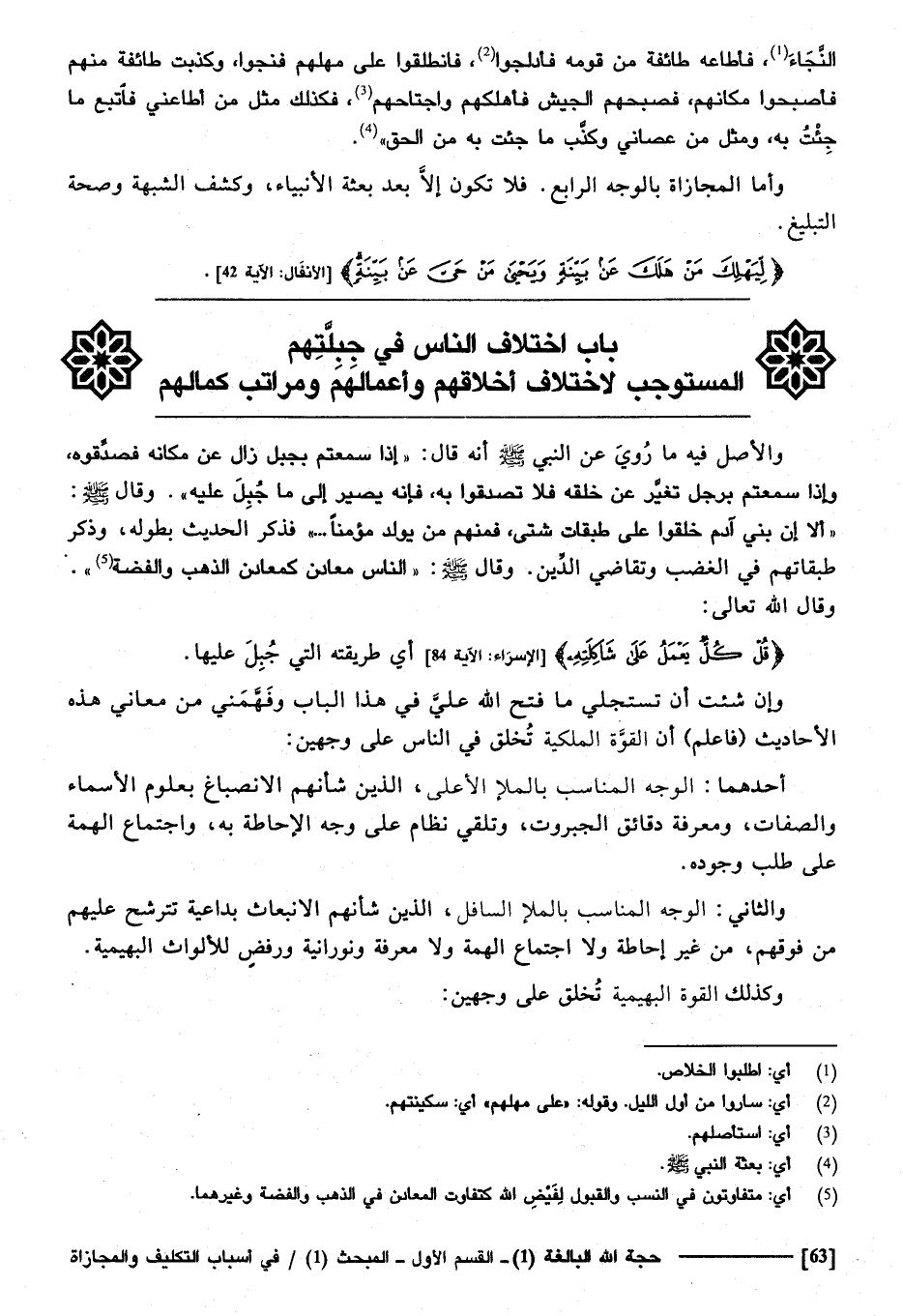 وَأَن شِئْت أَن تستجلي مَا فتح الله عَليّ فِي هَذَا الْبَاب، وفهمني من مَعَاني هَذِه الْأَحَادِيث (فَاعْلَم) أَن الْقُوَّة الملكية تخلق فِي النَّاس على وَجْهَيْن: أَحدهمَا الْوَجْه الْمُنَاسب بالملأ الْأَعْلَى الَّذِي شَأْنهمْ الانصباغ بعلوم الْأَسْمَاء وَالصِّفَات، وَمَعْرِفَة دقائق الجبروت، وتلقي النظام على وَجه الْإِحَاطَة بِهِ، واجتماع الهمة على طلب وجوده، وَالثَّانِي الْوَجْه الْمُنَاسب بالملأ السافل الَّذِي شَأْنهمْ انبعاث بداعية تترشح عَلَيْهِم من فَوْقهم من غير إحاطة، وَلَا اجْتِمَاع الهمة، وَلَا الْمعرفَة ونورانيه، ورفض للالواث البهيمية