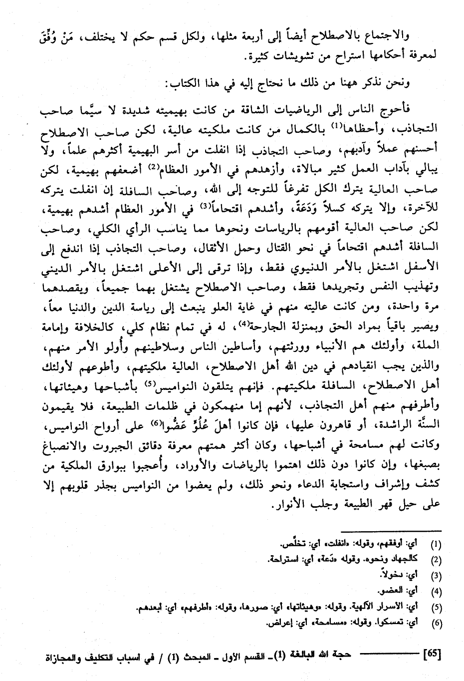 وَنحن نذْكر هَهُنَا من ذَلِك مَا نحتاج إِلَيْهِ فِي هَذَا الْكتاب فأحوج النَّاس إِلَى الرياضات الشاقة من كَانَت بهيميته شَدِيدَة لَا سِيمَا صَاحب التجاذب، وأحظاها بالكمال من كَانَت ملكيته عالية لَكِن صَاحب الِاصْطِلَاح أحْسنهم عملا وآدبهم، وَصَاحب التجاذب إِذا انفلت من أسر البهيمية أَكْثَرهم علما، وَلَا يُبَالِي بآداب الْعَمَل كثير مبالاة، وأزهدهم فِي الْأُمُور الْعِظَام أضعفهم بهيمية، لَكِن صَاحب الْعَالِيَة يتْرك الْكل تفرغا للتوجه إِلَى الله، وَصَاحب السافلة إِن انفلت يتْركهُ للآخرة وَإِلَّا يتْركهُ كسلا ودعة، وأشدهم اقتحاما فِي الْأُمُور الْعِظَام أَشَّدهم بهيمية لَكِن صَاحب الْعَالِيَة أقومهم بالرياسات وَنَحْوهَا مِمَّا يُنَاسب الرَّأْي الْكُلِّي، وَصَاحب السافلة أَشَّدهم اقتحاما فِي نَحْو الْقِتَال وَحمل الأثقال، وَصَاحب التجاذب إِذا انْدفع إِلَى الْأَسْفَل أشتغل بِالْأَمر الدنيوي فَقَط، وَإِذا ترقى إِلَى الْأَعْلَى اشْتغل بِالْأَمر الديني وتهذيب النَّفس وتجريدها فَقَط، وَصَاحب الِاصْطِلَاح يشْتَغل بهما جَمِيعًا، ويقصدهما مرّة وَاحِدَة، وَمن كَانَت عاليته مِنْهُم فِي غَايَة الْعُلُوّ ينبعث إِلَى رياسة الدّين وَالدُّنْيَا مَعًا، وَيصير بَاقِيا بِمُرَاد الْحق وبمنزلة الْجَارِحَة. لَهُ فِي تَمام نظام كلي كالخلافة وإمامة الْملَّة، وَأُولَئِكَ هم الْأَنْبِيَاء وورثتهم، وأساطين النَّاس وسلاطينهم، وأولو الْأَمر مِنْهُم وَالَّذين يجب انقيادهم فِي دين الله أهل الِاصْطِلَاح، الْعَالِيَة ملكيتهم، وأطوعهم لأولئك أهل الِاصْطِلَاح السافلة ملكيتهم، فَإِنَّهُم يتلقون النواميس بأشباحها