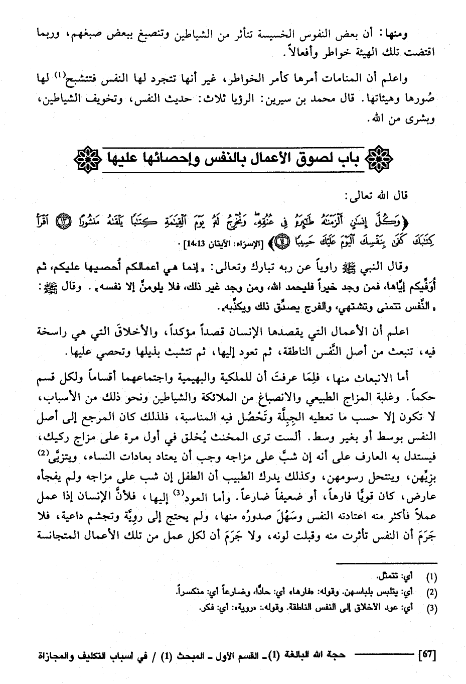 اعْلَم أَن الْأَعْمَال الَّتِي يقصدها الْإِنْسَان قصدا مؤكدا، والأخلاق الَّتِي هِيَ راسخة فِيهِ، تنبعث من أصل النَّفس الناطقة، ثمَّ تعود إِلَيْهَا، ثمَّ تتشبث بذيلها، وتحصي عَلَيْهَا إِمَّا الانبعاث مِنْهَا، فَلَمَّا عرفت أَن للملكية والبهيمية واجتماعهما أقساما وَلكُل قسم حكما، وَغَلَبَة المزاج الطبيعي والانصباغ من الْمَلَائِكَة وَالشَّيَاطِين وَنَحْو ذَلِك من الْأَسْبَاب لَا تكون إِلَّا حسب مَا تعطيه الجبلة، وَتحصل فِيهِ الْمُنَاسبَة، فَلذَلِك كَانَ الْمرجع إِلَى أصل النَّفس بوسط أَو بِغَيْر وسط. أَلَسْت ترى المخنث يخلق فِي أول مرّة على مزاج رَكِيك، فيستدل بِهِ الْعَارِف على أَنه أَن شب على مزاجه وَجب أَن يعْتَاد بعادات النِّسَاء، ويتزيا بزيهن، وينتحل رسومهن، وَكَذَلِكَ يدْرك الطَّبِيب أَن الطِّفْل إِن شب على مزاجه، وَلم يفجأه عَارض كَانَ قَوِيا فارها، أَو ضَعِيفا ضارعا، وَأما الْعود إِلَيْهَا فلَان الْإِنْسَان إِذا عمل عملا، فَأكْثر مِنْهُ