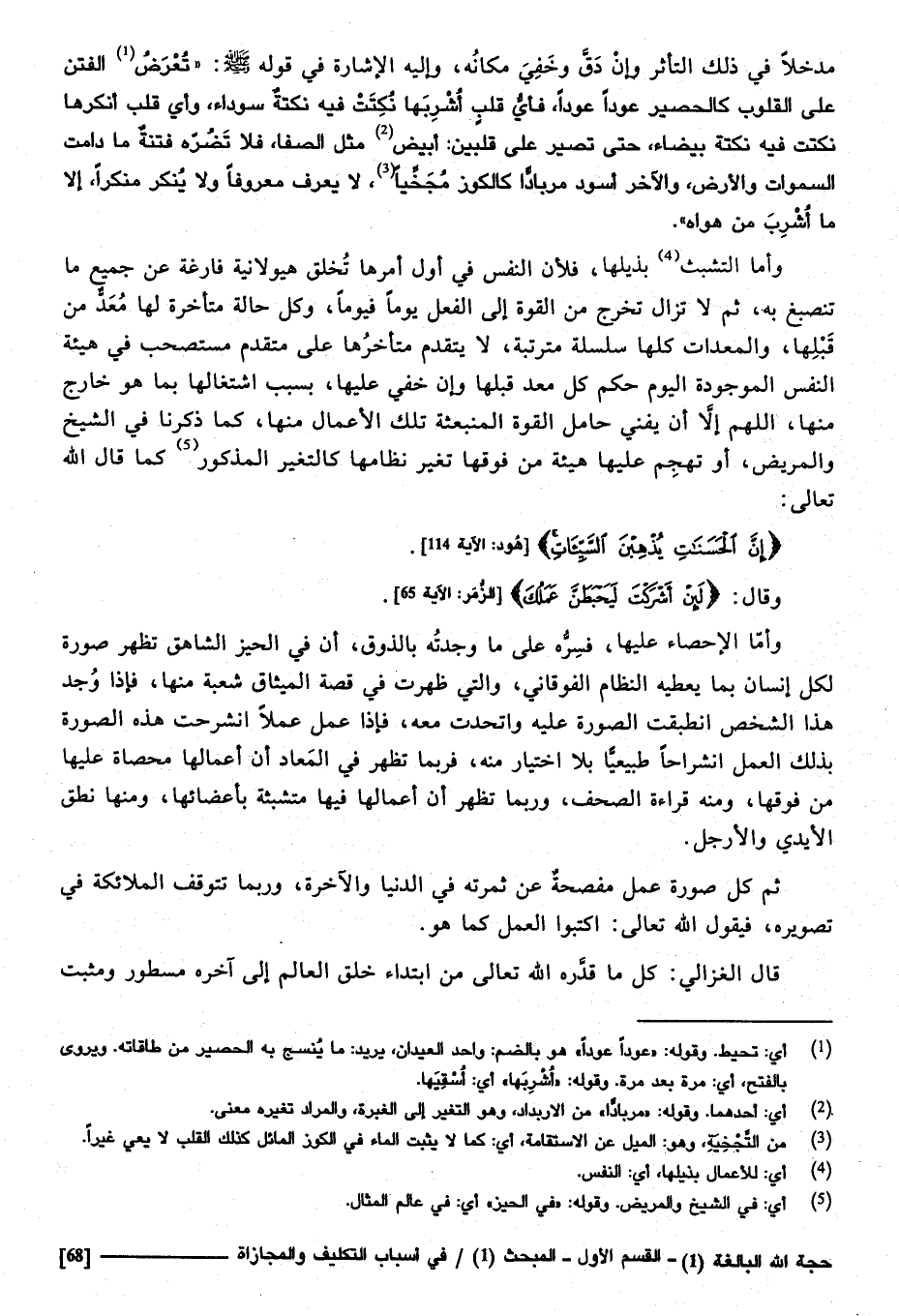 مدخلًا فِي ذَلِك التأثر، وَإِن دق، وخفي مَكَانَهُ، وَإِلَيْهِ الْإِشَارَة فِي قَوْله: صَلَّى اللهُ عَلَيْهِ وَسَلَّمَ " تعرض الْفِتَن على الْقُلُوب كالحصير عودا عودا، فَأَي قلب أشر بهَا نكتت فِيهِ نُكْتَة سَوْدَاء، وَأي قلب، أنكرها نكتت فِيهِ نُكْتَة بَيْضَاء حَتَّى تصير على قلبين أَبيض مثل الصَّفَا، فَلَا تضره فتْنَة مَا دَامَت السَّمَوَات وَالْأَرْض، وَالْآخر أسود مربادا كالكوز مجخيا لَا يعرف مَعْرُوفا، وَلَا يُنكر مُنْكرا إِلَّا مَا أشْرب من هَوَاهُ ".