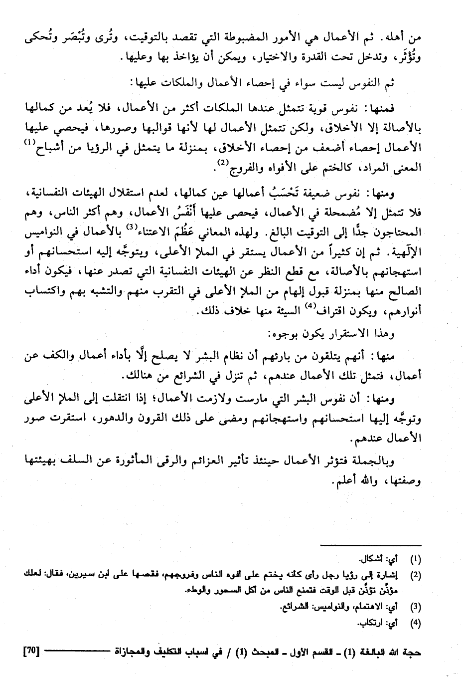 وَمِنْهَا نفوس ضَعِيفَة تحسب أَعمالهَا عين كمالها لعدم اسْتِقْلَال الهيئات النفسانية، فَلَا تتمثل إِلَّا مضمحلة فِي الْأَعْمَال، فيحصى عَلَيْهَا أنفس الْأَعْمَال وهم أَكثر النَّاس وهم المحتاجون جدا إِلَى التَّوْقِيت الْبَالِغ ولهذه الْمعَانِي عظم الاعتناء بِالْأَعْمَالِ فِي النواميس الإلهية، ثمَّ إِن كثيرا من الْأَعْمَال يسْتَقرّ فِي الْمَلأ الْأَعْلَى، وَيتَوَجَّهُ إِلَيْهِ استحسانهم أَو استهجانهم بِالْأَصَالَةِ مَعَ قطع النّظر عَن الهيئات النفسانية الَّتِي تصدر عَنْهَا، فَيكون أَدَاء الصَّالح مِنْهَا بِمَنْزِلَة قبُول إلهام من الْمَلأ الْأَعْلَى فِي التَّقَرُّب مِنْهُم والتشبه بهم واكتساب أنوارهم وَيكون اقتراف السَّيئَة مِنْهَا خلاف لذَلِك.