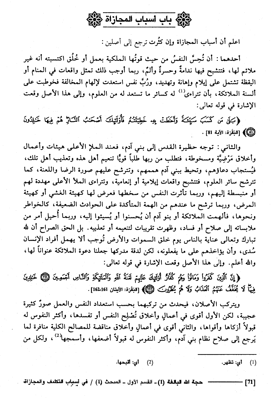 اعْلَم أَن أَسبَاب المجازاة وَإِن كثرت ترجع إِلَى أصلين: إِحْدَاهمَا أَن تحس النَّفس من حَيْثُ قوتها الملكية بِعَمَل أَو خلق اكتسبته أَنه غير ملائم لَهَا،