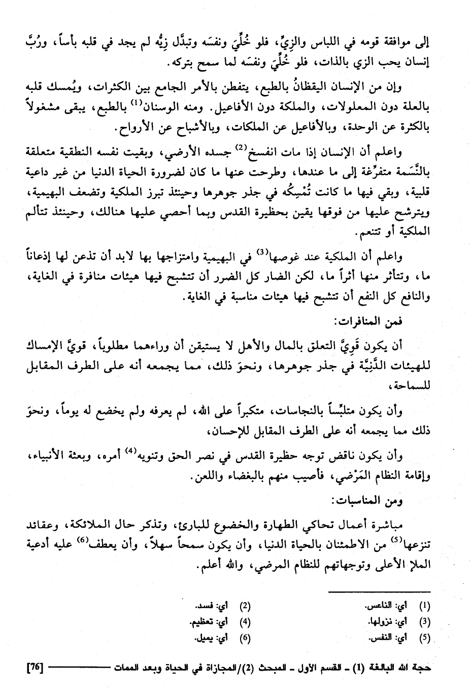 وَاعْلَم أَن الملكية عِنْد غوصها فِي البهيمية وامتزاجها بهَا لَا بُد أَن تذعن لَهَا إذعانا مَا، وتتأثر مِنْهَا أثرا مَا، لَكِن الضار كل الضَّرَر أَن تتشبح فِيهَا هيئات منافرة فِي الْغَايَة، والنافع كل النَّفْع أَن تتشبح فِيهَا هيآت مُنَاسبَة فِي الْغَايَة؛ فَمن المنافرات أَن يكون قوى التَّعَلُّق بِالْمَالِ والأهل لَا يستيقن أَن