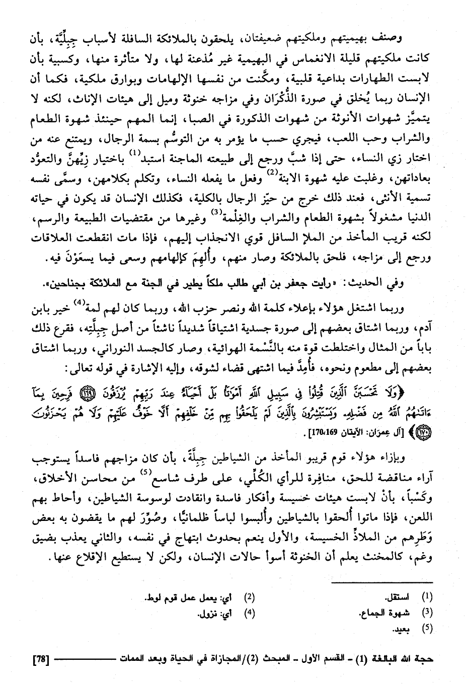 من شهوات الذُّكُورَة فِي الصِّبَا، وَإِنَّمَا المهم حِينَئِذٍ شَهْوَة الطَّعَام وَالشرَاب وَحب اللّعب، فَيجْرِي حسب مَا يَأْمر بِهِ من التوسم بسمة الرِّجَال، وَيمْتَنع عَنهُ من اخْتَار زِيّ النِّسَاء حَتَّى إِذا شب، وَرجع إِلَى طَبِيعَته الماجنة استبد بِاخْتِيَار زيهن والتعود بعاداتهن، وغلبت عَلَيْهِ شَهْوَة الأبنة وَفعل مَا يَفْعَله النِّسَاء، وَتكلم بكلامهن، وسمى نَفسه تَسْمِيَة الْأُنْثَى، فَعِنْدَ ذَلِك خرج من حيّز الرِّجَال بِالْكُلِّيَّةِ، فَكَذَلِك الْإِنْسَان قد يكون فِي حَيَاته الدُّنْيَا مَشْغُولًا بِشَهْوَة الطَّعَام وَالشرَاب والغلمة وَغَيرهَا من مقتضيات الطبيعة والرسم، لكنه قريب المأخذ من الْمَلأ السافل قوى الانجذاب إِلَيْهِم، فَإِذا مَاتَ انْقَطَعت العلاقات، وَرجع إِلَى مزاجه، فلحق بِالْمَلَائِكَةِ، وَصَارَ مِنْهُم، وألهم كالهامهم، وسعى فِيمَا يسعون فِيهِ.