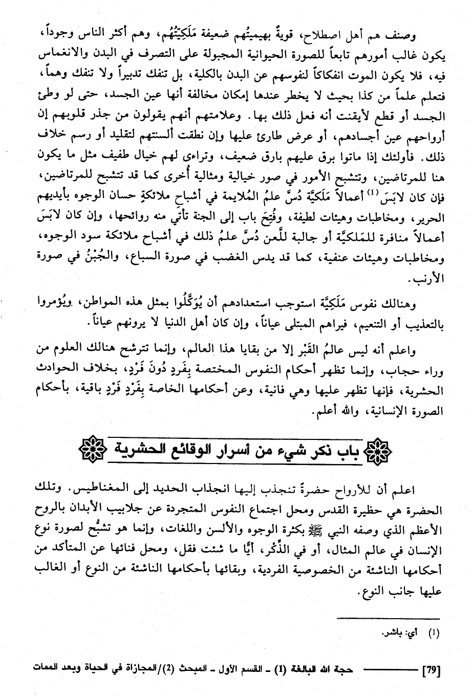وصنف هم أهل اصْطِلَاح. قَوِيَّة بهيميتهم. ضَعِيفَة ملكيتهم، وهم أَكثر النَّاس وجودا، يكون غَالب أُمُورهم تَابعا للصورة الحيوانية المجبولة على التَّصَرُّف فِي الْبدن والانغماس فِيهِ فَلَا يكون الْمَوْت انفكاكا لنفوسهم عَن الْبدن بِالْكُلِّيَّةِ، بل تنفك تدبيرا وَلَا تنفك وهما، فتعلم علما من كَذَا بِحَيْثُ لَا يخْطر عِنْدهَا إِمْكَان مُخَالفَة أَنَّهَا عين الْجَسَد، حَتَّى لَو وطئ الْجَسَد، أَو قطع لأيقنت أَنه فعل ذَلِك بهَا، وعلامتهم أَنهم يَقُولُونَ من جذر قُلُوبهم إِن أَرْوَاحهم عين أَجْسَادهم، أَو عرض طَارِئ عَلَيْهَا وَإِن نطقت ألسنتهم لتقليد أَو رسم خلاف ذَلِك فَأُولَئِك إِذا مَاتُوا برق عَلَيْهِم بارق ضَعِيف، وتراءى لَهُم خيال ضفيف مثل مَا يكون هُنَا للمرتاضين، وتتشبح الْأُمُور فِي صور خيالية ومثالية أُخْرَى كَمَا قد تتشبح للمرتاضين، فَإِن كَانَ لابس أعمالا ملكية دس علم الملايمة فِي أشباح مَلَائِكَة حسان الْوُجُوه بِأَيْدِيهِم الْحَرِير ومخاطبات وهيئآت لَطِيفَة وَفتح بَاب إِلَى الْجنَّة تَأتي مِنْهُ روائحها، وَإِن كَانَ لابس أعمالا منافرة للملكية أَو جالية للعن دس علم ذَلِك فِي أشباح مَلَائِكَة سود الْوُجُوه ومخاطبات وهيآت عنفية، كَمَا قد يدس الْغَضَب فِي صُورَة السبَاع، والجبن فِي صُورَة الأرنب.