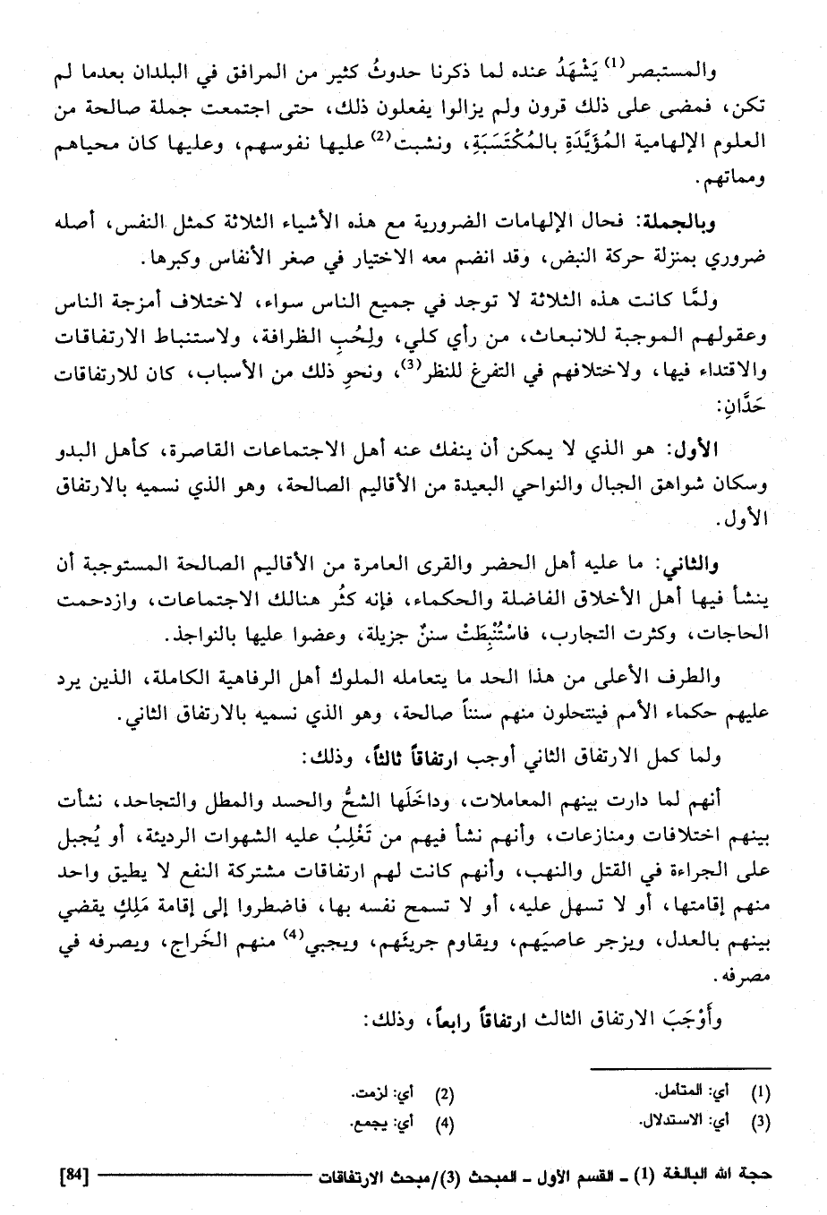 الأول هُوَ الَّذِي لَا يُمكن أَن يَنْفَكّ عَنهُ أهل الاجتماعات القاصرة كَأَهل البدو وسكان شَوَاهِق الْجبَال والنواحي الْبَعِيدَة من الأقاليم الصَّالِحَة، وَهُوَ الَّذِي نُسَمِّيه بالارتفاق الأول.