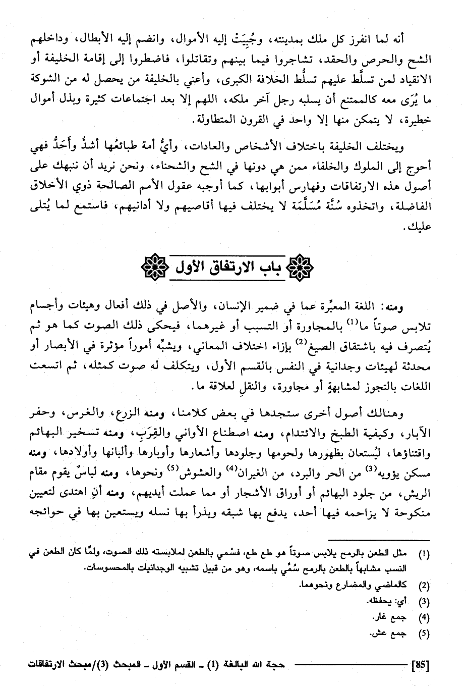 أَنه لما انفرز كل ملك بمدينته، وجبى إِلَيْهِ الْأَمْوَال، وانظم إِلَيْهِ الْأَبْطَال، وداخلهم الشُّح والحرص والحقد، تشاجروا فِيمَا بَينهم، وتقاتلوا، فاضطروا إِلَى إِقَامَة الْخَلِيفَة، أَو الانقياد لمن تسلط عَلَيْهِم تسلط الْخلَافَة الْكُبْرَى، وأعني بالخليفة من يحصل لَهُ من الشَّوْكَة مَا يرى مَعَه، كالممتنع أَن يسلبه رجل آخر ملكه، اللَّهُمَّ إِلَّا بعد اجتماعات كَثِيرَة، وبذل أَمْوَال خطيرة لَا يتَمَكَّن مِنْهَا إِلَّا وَاحِد فِي الْقُرُون المتطاولة، وَيخْتَلف الْخَلِيفَة باخْتلَاف الْأَشْخَاص والعادات، وَأي أمة طبائعها أَشد وَأحد، فَهِيَ أحْوج إِلَى الْمُلُوك وَالْخُلَفَاء مِمَّن هِيَ دونهمَا فِي الشُّح والشحناء، وَنحن نُرِيد أَن ننبهك على أصُول هَذِه الارتفاقات وفهارس أَبْوَابهَا، كَمَا أوجبه عقول الْأُمَم الصَّالِحَة ذَوي الْأَخْلَاق الفاضلة، واتخذوه سنة مسلمة لَا يخْتَلف فِيهَا أقاصيهم، وَلَا أذانيهم، فاستمع لما يُتْلَى عَلَيْك.