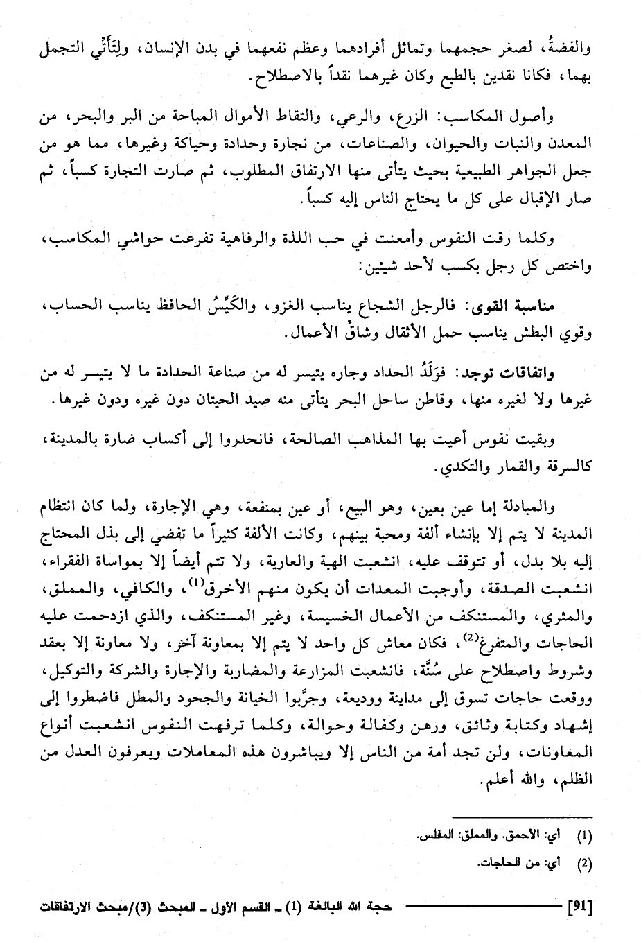 والمبادلة إِمَّا عين بِعَين، وَهُوَ البيع، أَو عين بِمَنْفَعَة، وَهِي الْإِجَارَة، وَلما كَانَ انتظام الْمَدِينَة لَا يتم إِلَّا بإنشاء ألفة ومحبة بَينهم، وَكَانَت الألفة كثيرا مَا تُفْضِي إِلَى بذل الْمُحْتَاج إِلَيْهِ بِلَا بدل أَو تتَوَقَّف عَلَيْهِ انشعبت الْهِبَة وَالْعَارِية، وَلَا تتمّ أَيْضا إِلَّا بمواساة الْفُقَرَاء انشعبت الصَّدَقَة وأوجبت المعدات أَن يكون مِنْهُم الأخرق وَالْكَافِي والمملق والمثري والمستنكف من الْأَعْمَال الخسيسة وَغير المستنكف وَالَّذِي ازدحمت عَلَيْهِ الْحَاجَات والمتفرغ، فَكَانَ معاش كل وَاحِد لَا يتم إِلَّا بمعاونة آخر، وَلَا معاونة إِلَّا بِعقد وشروط واصطلاح على سنة، فانشعبت الْمُزَارعَة وَالْمُضَاربَة وَالْإِجَارَة وَالشَّرِكَة وَالتَّوْكِيل، وَوَقعت حاجات تَسوق إِلَى مداينة ووديعة، وجربوا الْخِيَانَة والجحود والمطل فاضطروا إِلَى إِشْهَاد وَكِتَابَة وثائق وَرهن وكفالة وحوالة، وَكلما ترفهت النُّفُوس انشعبت أنوع المعاونات، وَلنْ تَجِد أمة من النَّاس إِلَّا ويباشرون هَذِه الْمُعَامَلَات ويعرفون الْعدْل من الظُّلم وَالله أعلم.