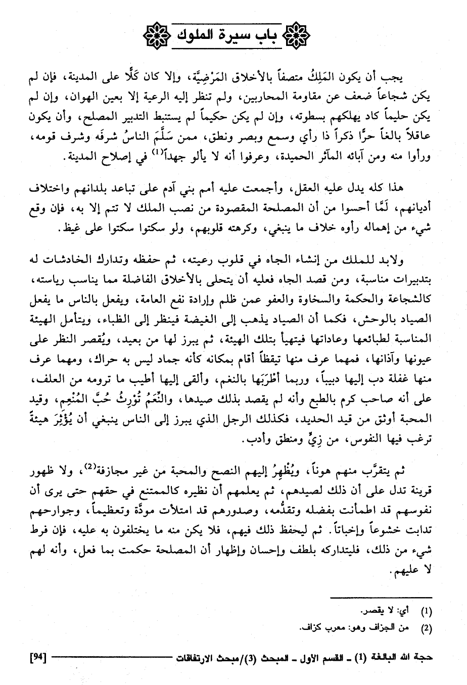 إِلَّا بِعَين الهوان، وَإِن لم يكن حَلِيمًا كَاد يُهْلِكهُمْ بسطوته، وَإِن لم يكن حكيما لم يستنبط التَّدْبِير المصلح، وَأَن يكون عَاقِلا بَالغا حرا ذكرا ذار أَي وَسمع وبصر ونطق مِمَّن سلم النَّاس شرفه وَشرف قومه، وَرَأَوا مِنْهُ وَمن آبَائِهِ المآثر الحميدة، وَعرفُوا أَنه لَا يألو جهدا فِي إصْلَاح الْمَدِينَة، هَذَا كُله يدل عَلَيْهِ الْعقل، وأجمعت عَلَيْهِ أُمَم بني آدم على تبَاعد بلداتهم وَاخْتِلَاف أديانهم لما أحسوا من أَن الْمصلحَة الْمَقْصُودَة من نصب الْملك لَا تتمّ إِلَّا بِهِ، فَإِن وَقع شَيْء من إهماله رَأَوْهُ خلاف مَا يَنْبَغِي، وكرهته قُلُوبهم، وَلَو سكتوا سكتوا على غيظ.