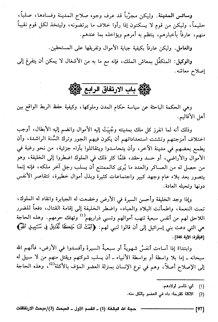وَهِي الْحِكْمَة الباحثة عَن سياسة حكام المدن وملوكها، وَكَيْفِيَّة حفظ الرَّبْط الْوَاقِع بَين أهل الأقاليم، وَذَلِكَ أَنه لما انفرز كل ملك بمدينته، وجبي إِلَيْهِ الْأَمْوَال، وانظم إِلَيْهِ الْأَبْطَال أوجب اخْتِلَاف أمزجتهم وتشتت استعداداتهم أَن يكون فيهم الْجور وَترك السّنة الراشدة، وَأَن يطْمع بَعضهم فِي مَدِينَة الْآخِرَة، وَأَن يتحاسدوا، ويتقاتلوا باراء جزئية من نَحْو رَغْبَة فِي الْأَمْوَال والأراضي، أَو حسد وحقد، فَلَمَّا كثر ذَلِك فِي الْمُلُوك اضطروا إِلَى الْخَلِيفَة، وَهُوَ من حصل لَهُ من العساكر وَالْعدَد مَا يرى كالممتنع أَن يسلب رجل آخر ملكه، فَإِنَّهُ إِنَّمَا يتَصَوَّر بعد بلَاء عَام وَجهد كَبِير واجتماعات كَثِيرَة وبذل أَمْوَال خطيرة تتقاصر الْأَنْفس دونهَا وتحيله الْعَادة، وَإِذا وجد الْخَلِيفَة، وَأحسن السِّيرَة فِي الأَرْض، وخضعت لَهُ الْجَبَابِرَة، وانقاد لَهُ الْمُلُوك تمت النِّعْمَة، واطمأنت الْبِلَاد والعباد، واضطر الْخَلِيفَة إِلَى إِقَامَة الْقِتَال دفعا للضَّرَر اللَّاحِق لَهُم من أنفس سبعية تنهب أَمْوَالهم، وَتَسْبِي ذَرَارِيهمْ، وتهتك حرمهم، وَهَذِه الْحَاجة هِيَ الَّتِي دعت بني إِسْرَائِيل إِلَى أَن قَالُوا لنَبِيّ لَهُم. {ابْعَثْ لنا ملكا نُقَاتِل فِي سَبِيل الله}