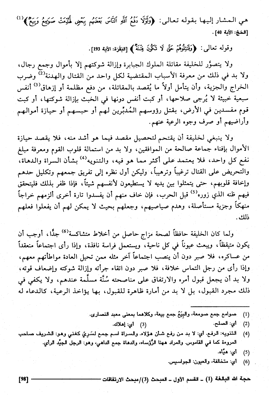 وَلَا يتَصَوَّر للخليفة مقاتلة الْمُلُوك الْجَبَابِرَة وَإِزَالَة شوكتهم إِلَّا بأموال وَجمع رجال، وَلَا بُد فِي ذَلِك من معرفَة الْأَسْبَاب الْمُقْتَضِيَة لكل وَاحِد من الْقِتَال والهدنة، وَضرب الْخراج والجزية، وَأَن يتَأَمَّل أَولا مَا يقْصد بالمقاتلة من دفع مظْلمَة أَو إزهاق أنفس سبعية خبيثة لَا يرجي صَلَاحهَا، أَو كبت أنفس دونهَا فِي الْخبث بِإِزَالَة شوكتها، أَو كبت قوم مفسدين فِي الأَرْض بقتل رُءُوسهم المدبرين لَهُم أَو حَبسهم أَو حِيَازَة أَمْوَالهم وأراضيهم أَو صرف وُجُوه الرّعية عَنْهُم.