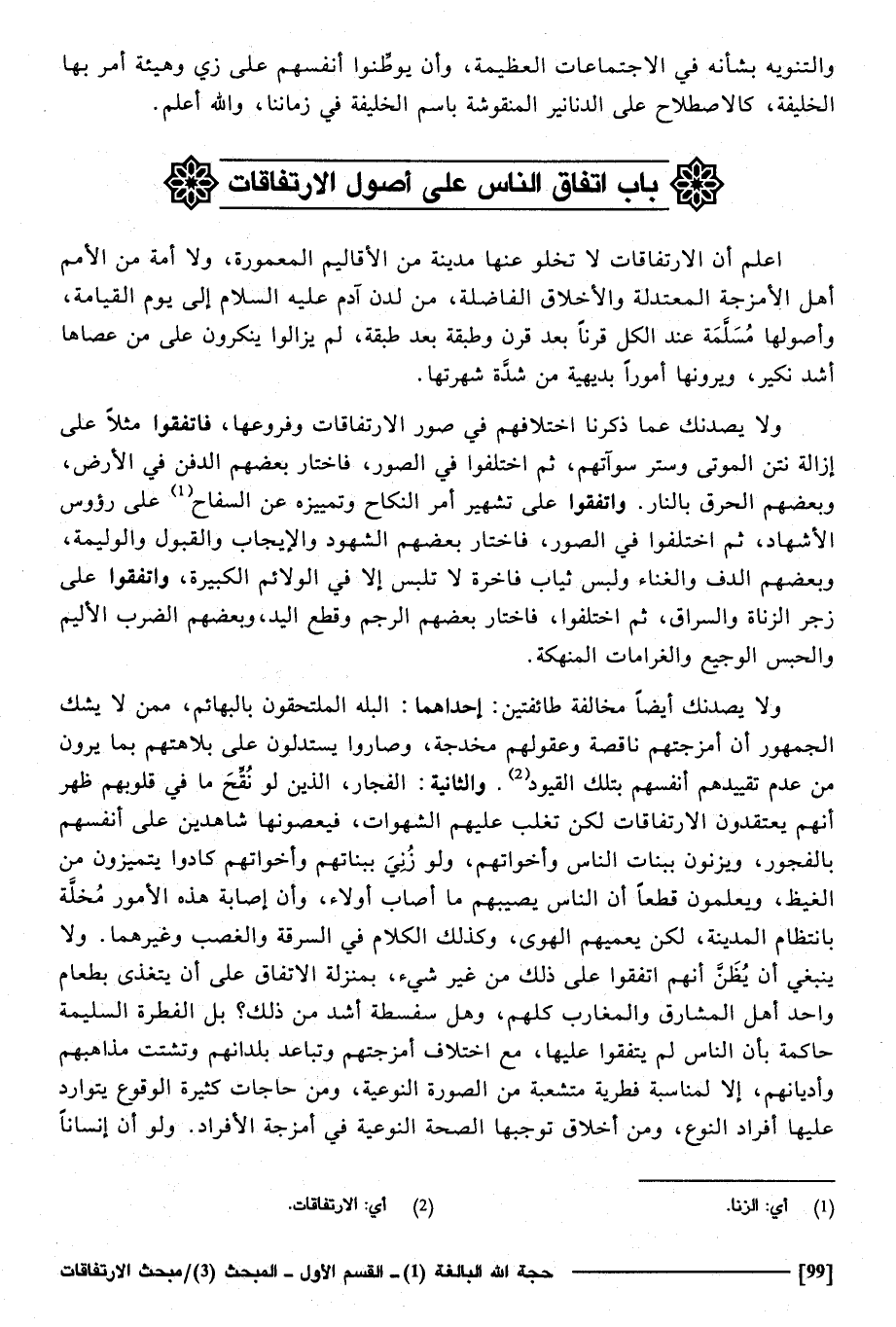 وَاتَّفَقُوا على تشهير أَمر النِّكَاح وتمييزه عَن السفاح على رُءُوس الأشهاد، ثمَّ اخْتلفُوا فِي الصُّور، فَاخْتَارَ بَعضهم الشُّهُود والإيجاب وَالْقَبُول والوليمة، وَبَعْضهمْ الدُّف والغناء وَلبس ثِيَاب فاخرة لَا تلبس إِلَّا فِي الولائم الْكَبِيرَة، وَاتَّفَقُوا على زجر الزِّنَا والسراق ثمَّ اخْتلفُوا، فَاخْتَارَ بَعضهم الرَّجْم وَقطع الْيَد، وَبَعْضهمْ الضَّرْب والأليم وَالْحَبْس الوجيع والغرامات المنهكة، وَلَا يصدنك أَيْضا مُخَالفَة طائفتين، أَحدهمَا البلة الملتحقون بالبهائم مِمَّن لَا يشك الْجُمْهُور أَن أمزجتهم نَاقِصَة وعقولهم مخدجة، وصاروا يستدلون على بلاهتهم بِمَا يرَوْنَ من عدم تقييدهم أنفسهم بِتِلْكَ الْقُيُود، وَالثَّانيَِة الْفجار الَّذين لَو نقح مَا فِي قُلُوبهم ظهر أَنهم يَعْتَقِدُونَ الارتفاقات لَكِن تغلب عَلَيْهِم الشَّهَوَات، فيعصونها شَاهِدين على أنفسهم بِالْفُجُورِ، ويزنون ببنات النَّاس وأخواتهم، وَلَو زني ببناتهم وأخواتهم كَادُوا يتميزون من الغيظ، ويعلمون قطعا أَن النَّاس يصيبهم مَا أصَاب أولاء، وَإِن إِصَابَة هَذِه الْأُمُور مخلة بانتظام الْمَدِينَة لَكِن يعميهم الْهوى، وَكَذَلِكَ الْكَلَام فِي السّرقَة وَالْغَصْب وَغَيرهمَا، وَلَا يَنْبَغِي أَن يظنّ أَنهم اتَّفقُوا على ذَلِك من غير شَيْء بِمَنْزِلَة الِاتِّفَاق على أَن يتغذى بِطَعَام وَاحِد أهل الْمَشَارِق والمغارب كلهم وَهل سفسطه أَشد من ذَلِك؟ بل الْفطْرَة السليمة حاكمة بِأَن النَّاس لم يتفقوا عَلَيْهَا مَعَ اخْتِلَاف أمزجتهم وتباعد بلدانهم وتشتت مذاهبهم وأديانهم إِلَّا لمناسبة فطرية متشعبة من الصُّورَة النوعية، وَمن حاجات كَثِيرَة الْوُقُوع يتوارد عَلَيْهَا أَفْرَاد النَّوْع، وَمن أَخْلَاق توجبها الصِّحَّة النوعية فِي أمزجة الْأَفْرَاد، وَلَو أَن إنْسَانا