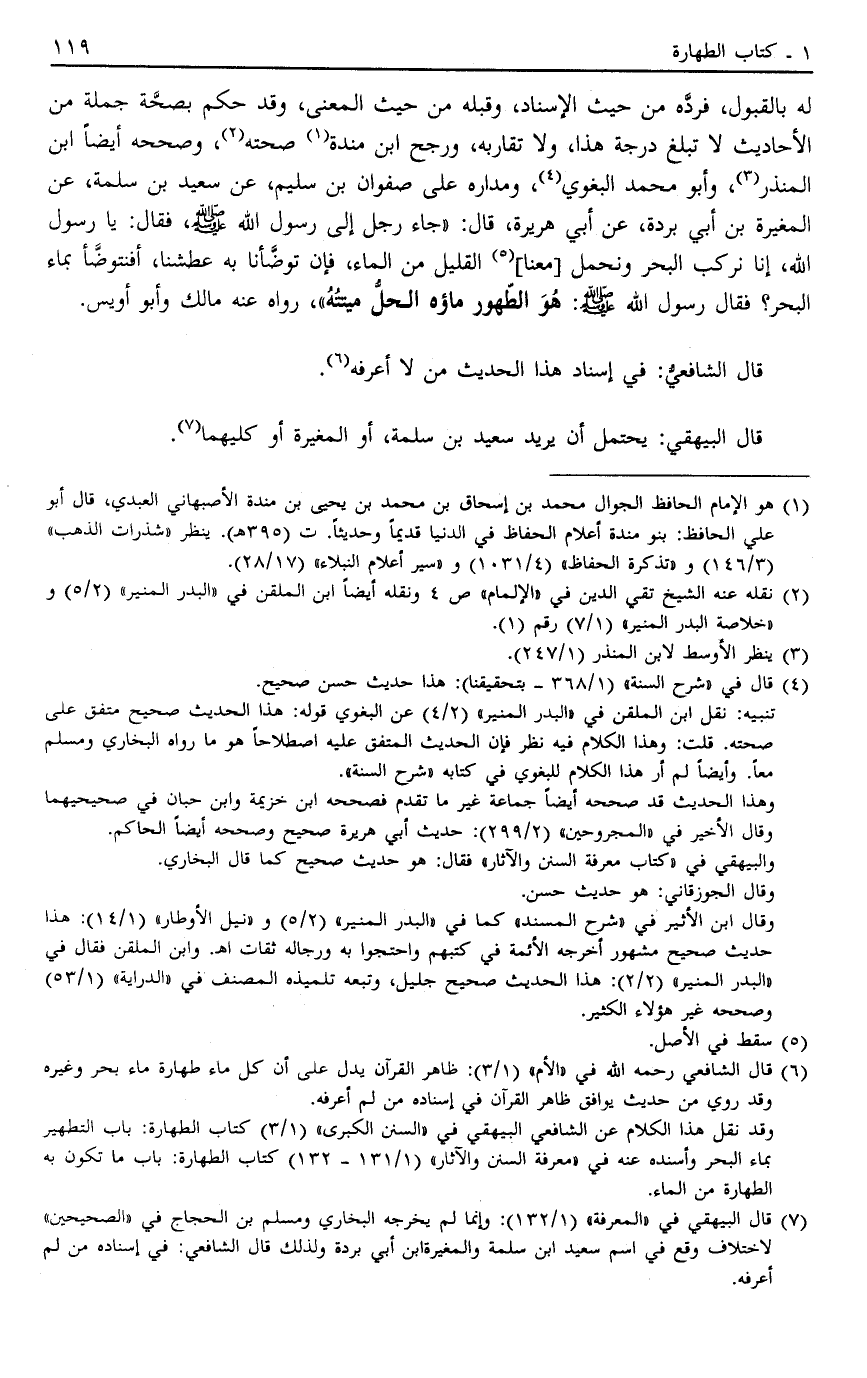 7 قال البيهقي في "المعرفة" "1/132": وإنما لم يخرجه البخاري ومسلم بن الحجاج في "الصحيحين" لاختلاف وقع في اسم سعيد ابن سلمة والمغيرة ابن أبي بردة ولذلك قال الشافعي: في إسناده من لم أعرفه.