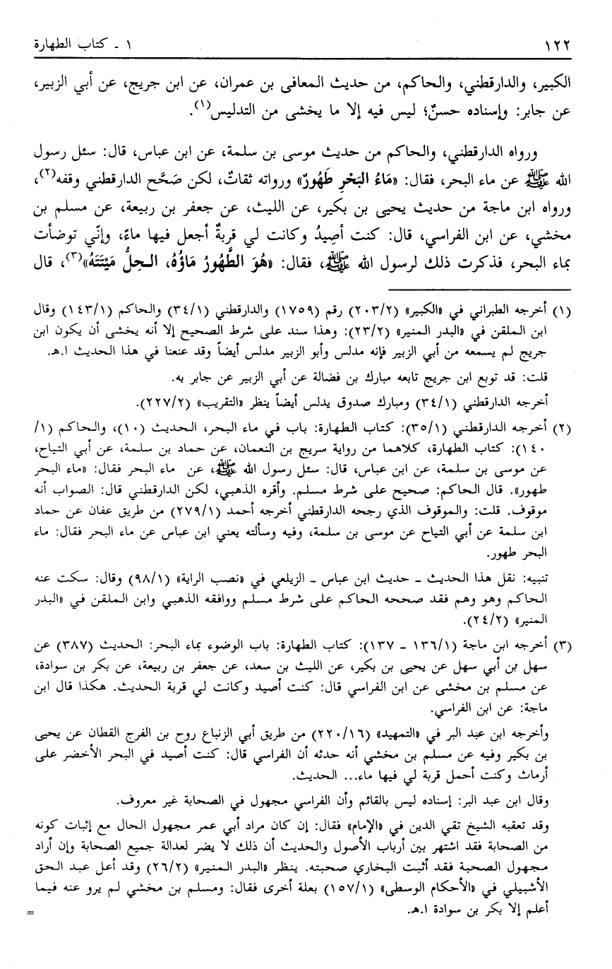 1 أخرجه الطبراني في "الكبير" "2/203" رقم "1759" والدارقطني "1/34" والحاكم "1/143" وقال ابن الملقن في "البدر المنير" "2/23": وهذا سند على شرط الصحيح إلا أنه يخشى أن يكون ابن جريج لم يسمعه من أبي الزبير فإنه مدلس وأبو الزبير مدلس أيضاً وقد عنعنا في هذا الحديث ا. هـ.