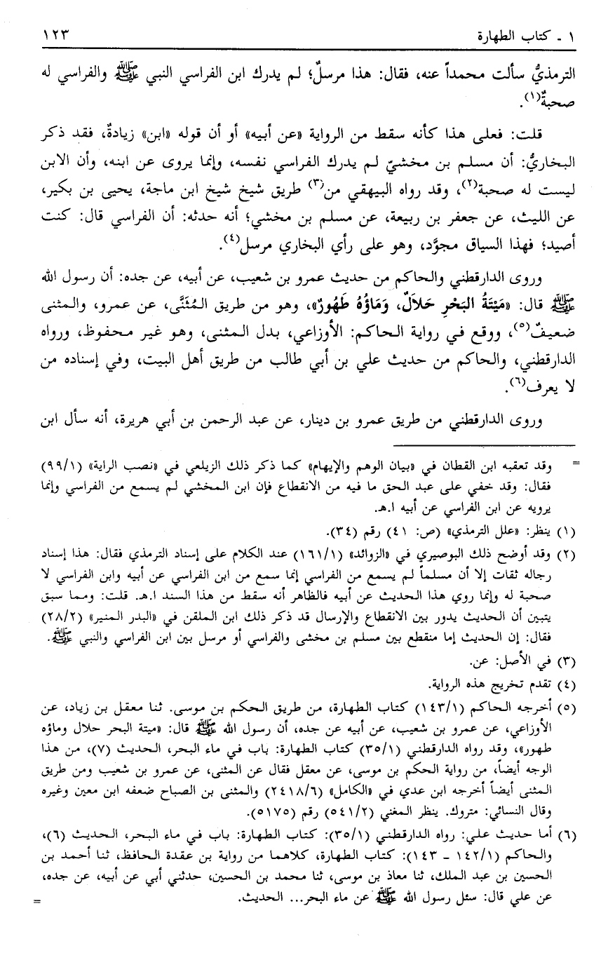 6 أما حديث علي: رواه الدارقطني "1/35": كتاب الطهارة: باب في ماء البحر، الحديث "6"، والحاكم "1/142- 143": كتاب الطهارة، كلاهما من رواية بن عقدة الحافظ، ثنا أحمد بن الحسين بن عبد الملك، ثنا معاذ بن موسى، ثنا محمد بن الحسين، حدثني أبي عن أبيه، عن جده، عن علي قال: سئل رسول الله صَلَّى اللَّهُ عَلَيْهِ وَسَلَّمَ عن ماء البحر ... الحديث. وسكت عنه الحاكم.