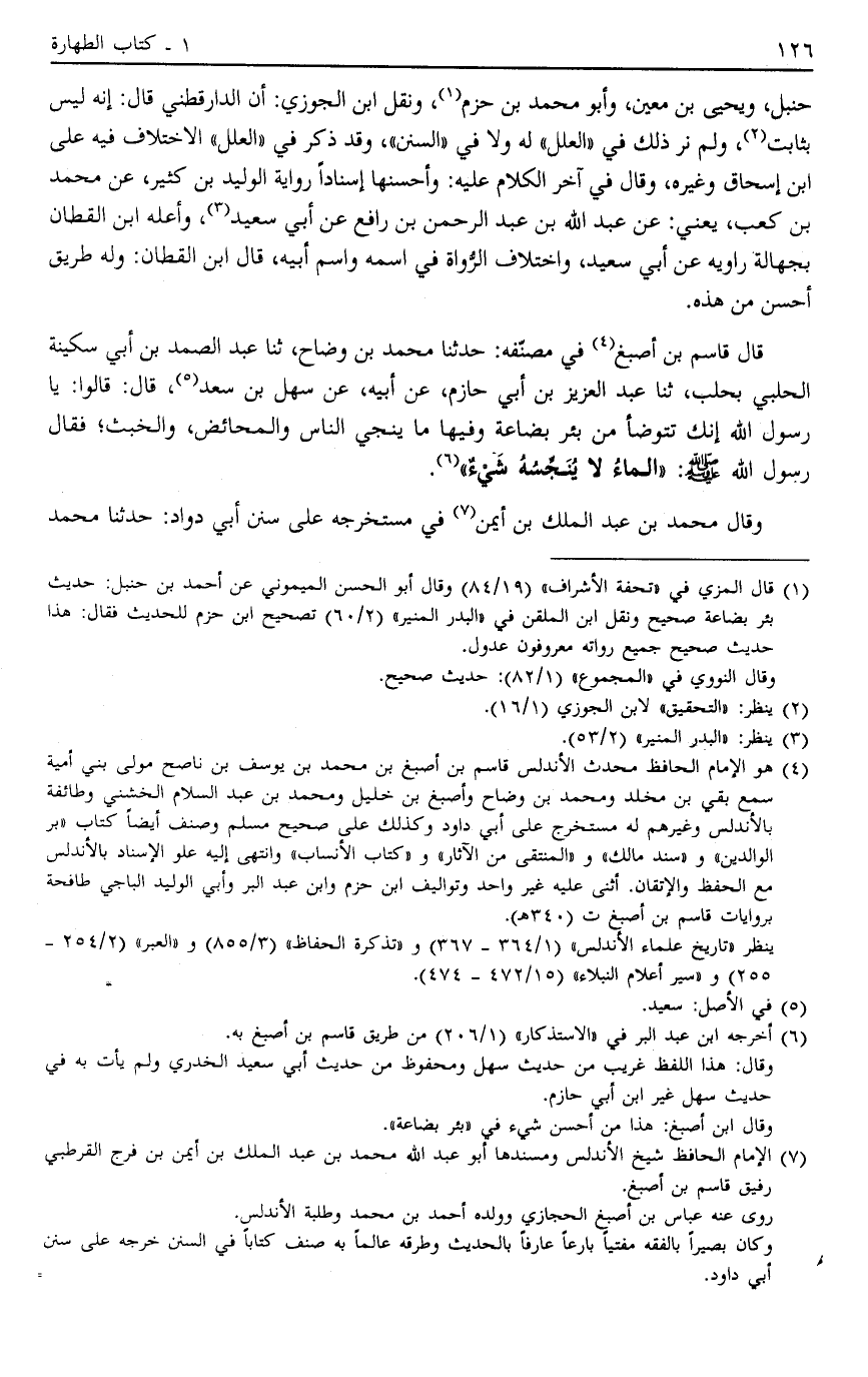 قَالَ قَاسِمُ بْنُ أَصْبَغَ4 فِي مُصَنَّفِهِ ثَنَا مُحَمَّدُ بْنُ وَضَّاحٍ ثَنَا عَبْدُ الصَّمَدِ بْنُ أَبِي سَكِينَةَ الْحَلَبِيُّ بِحَلَبِ ثَنَا عَبْدُ الْعَزِيزِ بْنُ أَبِي حَازِمٍ عَنْ أَبِيهِ عَنْ سَهْلِ بْنِ سَعْدٍ5 قَالَ قَالُوا يَا رَسُولَ اللَّهِ إنَّك تَتَوَضَّأُ مِنْ بِئْرِ بُضَاعَةَ وَفِيهَا مَا يُنْجِي النَّاسُ وَالْمَحَائِضُ وَالْخَبَثُ فَقَالَ رَسُولُ اللَّهِ صَلَّى اللَّهُ عَلَيْهِ وَسَلَّمَ: "الْمَاءُ لَا يُنَجِّسُهُ شَيْءٌ" 6.