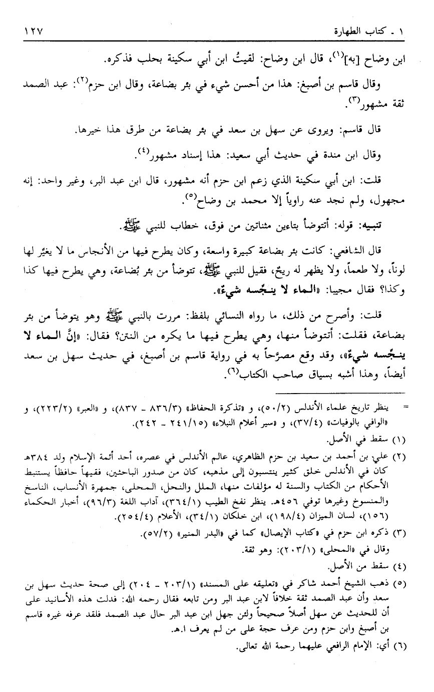 وَقَالَ قَاسِمُ بْنُ أَصْبَغَ: هَذَا مِنْ أَحْسَنِ شَيْءٍ فِي بِئْرِ بُضَاعَةَ وَقَالَ ابْنُ حَزْمٍ2 عَبْدُ الصَّمَدِ ثِقَةٌ مَشْهُورٌ3.