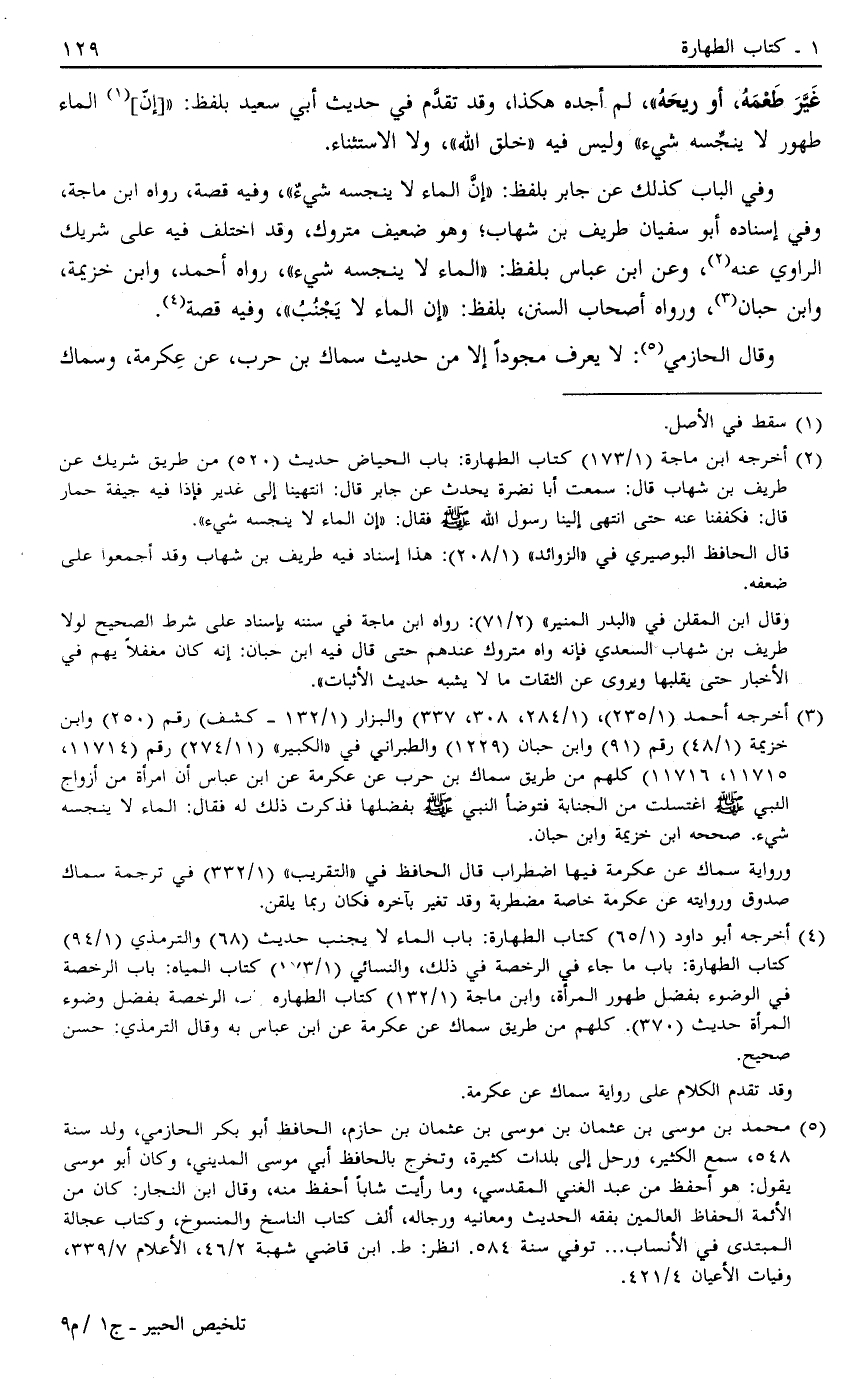 3 أخرجه أحمد "1/235"، "1/284، 308، 337" والبزار "1/132- كشف" رقم "250" وابن خزيمة "1/48" رقم "91" وابن حبان "1229" والطبراني في "الكبير" "11/274" رقم "11714،11715، 11716" كلهم من طريق سماك بن حرب عن عكرمة عن ابن عباس أن امرأة مر أزواج النبي صَلَّى اللَّهُ عَلَيْهِ وَسَلَّمَ صَلَّى اللَّهُ عَلَيْهِ وَسَلَّمَ اغتسلت من الجنابة فتوضأ النبي صَلَّى اللَّهُ عَلَيْهِ وَسَلَّمَ صَلَّى اللَّهُ عَلَيْهِ وَسَلَّمَ بفضلها فذكرت ذلك له فقال: "الماء لا ينجسه شيء". صححه ابن خزيمة وابن حبان.