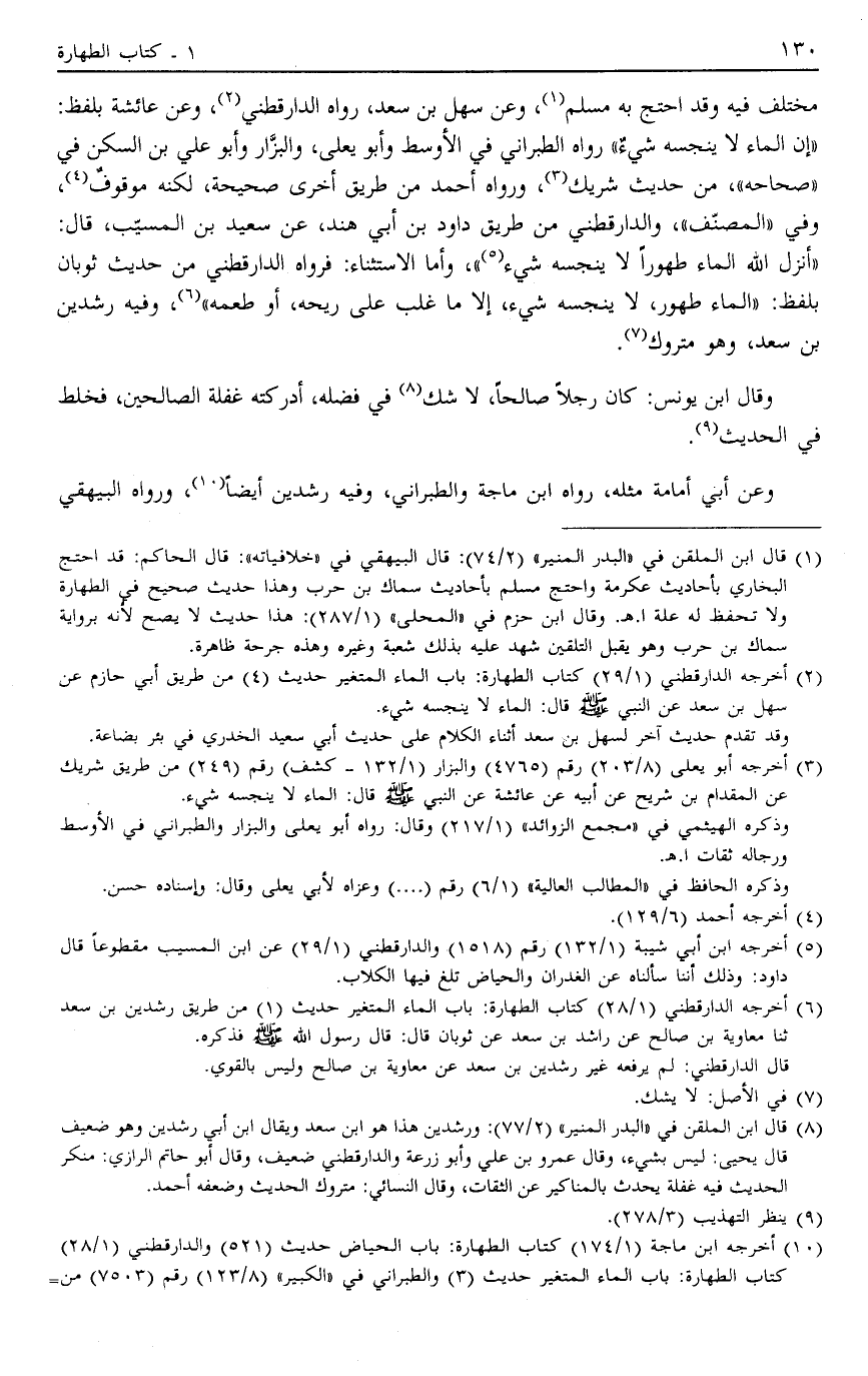 10 أخرجه ابن ماجة "1/174" كتاب الطهارة: باب الحياض حديث "521" والدارقطني "1/28" كتاب الطهارة: باب الماء المتغير حديث "3" والطبراني في "الكبير" "8/123" رقم "7503" من طريق رشدين بن سعد عن معاوية بن صالح عن راشد بن سعد عن أبي إمامة عن النبي صَلَّى اللَّهُ عَلَيْهِ وَسَلَّمَ قال: الماء لا ينجسه شيء إلا ما غلب على ريحه أو طعمه أو لونه.