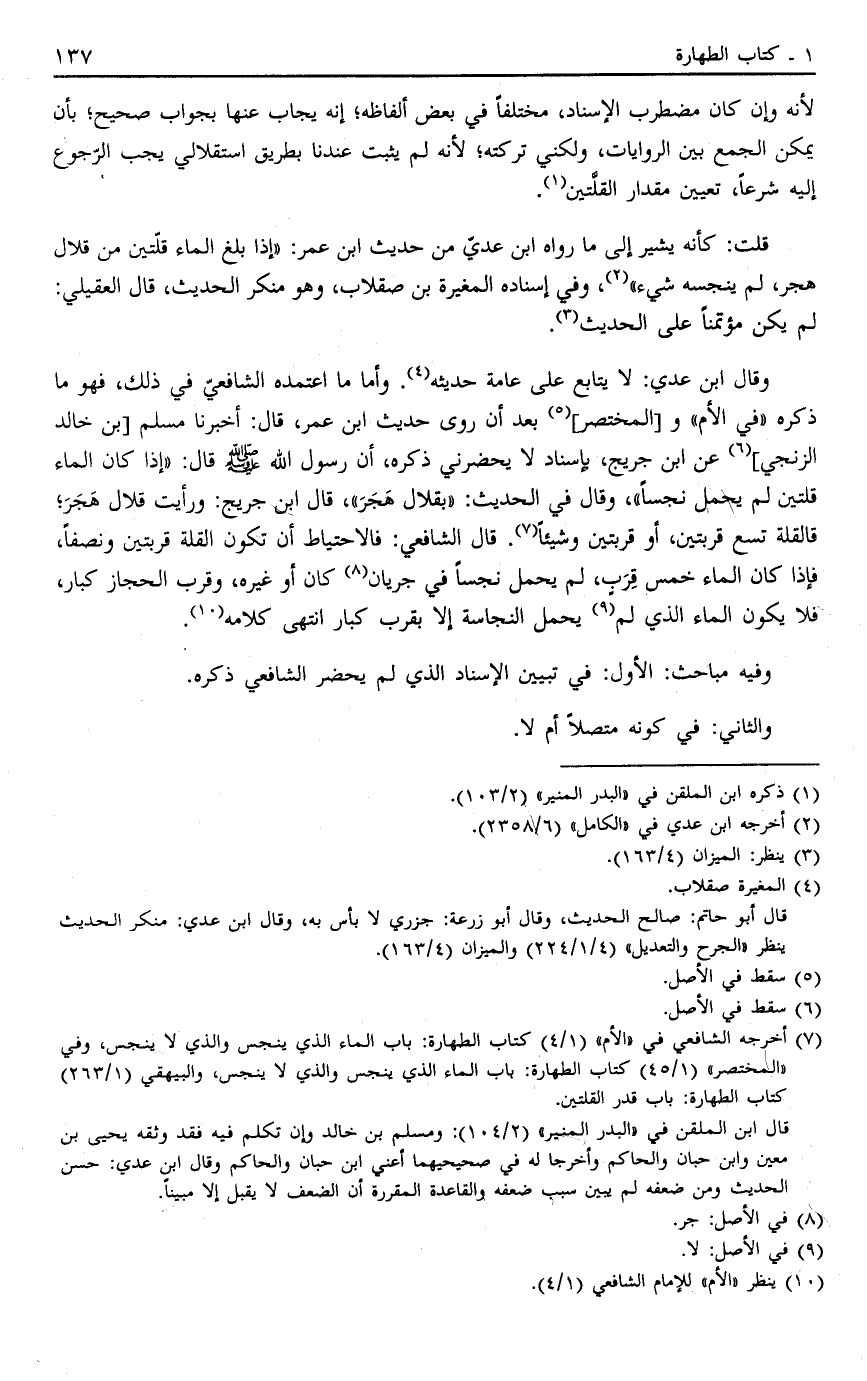 وَقَالَ ابْنُ عَدِيٍّ: لَا يُتَابَعُ عَلَى عَامَّةِ حَدِيثِهِ4 وَأُمًّا مَا اعْتَمَدَهُ الشَّافِعِيُّ فِي ذَلِكَ فَهُوَ مَا ذَكَرَهُ فِي الأم و [المختصر] 5 بَعْدَ أَنْ رَوَى حَدِيثَ ابْنِ عُمَرَ قَالَ أَخْبَرْنَا مُسْلِمُ [بْنُ خَالِدٍ الزِّنْجِيُّ] 6 عَنْ ابْنِ جُرَيْجٍ بِإِسْنَادٍ لَا يَحْضُرُنِي ذِكْرُهُ أَنَّ رَسُولَ اللَّهِ صَلَّى اللَّهُ عَلَيْهِ وَسَلَّمَ قَالَ: "إذَا كَانَ الْمَاءُ قُلَّتَيْنِ لَمْ يَحْمِل نَجَسًا" وَقَالَ فِي الْحَدِيثِ "بِقِلَالِ هَجَرَ" قَالَ ابْنُ جُرَيْجٍ وَرَأَيْت قِلَالَ هَجَرَ فَالْقُلَّةُ تَسَعُ قِرْبَتَيْنِ أَوْ قِرْبَتَيْنِ وَشَيْئًا7. قَالَ الشَّافِعِيُّ: فَالِاحْتِيَاطُ أَنْ تَكُونَ الْقِلَّةُ قِرْبَتَيْنِ وَنِصْفًا فَإِذَا كَانَ الْمَاءُ خَمْسَ قِرَبٍ لَمْ يَحْمِلْ نَجَسَا فِي جريان8 كَانَ أَوْ غَيْرِهِ وَقِرَبُ الْحِجَازِ كِبَارٌ فَلَا يَكُونُ الماء الذي لم9 يَحْمِلُ النَّجَاسَةَ إلَّا بِقِرَبٍ كِبَارٍ انْتَهَى كَلَامُهُ10.