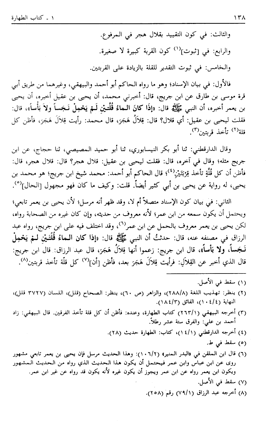 فَالْأَوَّلُ: فِي بَيَانِ الْإِسْنَادِ وَهُوَ مَا رَوَاهُ الْحَاكِمُ أَبُو أَحْمَدَ وَالْبَيْهَقِيُّ وَغَيْرُهُمَا مِنْ طَرِيقِ أَبِي قُرَّةَ مُوسَى بْنِ طَارِقٍ عَنْ ابْنِ جُرَيْجٍ قَالَ: أَخْبَرَنِي مُحَمَّدُ أَنَّ يَحْيَى بْنَ عُقَيْلٍ أَخْبَرَهُ أَنَّ يَحْيَى بْنَ يَعْمُرَ أَخْبَرَهُ أَنَّ النَّبِيَّ صَلَّى اللَّهُ عَلَيْهِ وَسَلَّمَ قَالَ: "إذَا كَانَ الْمَاءُ قُلَّتَيْنِ لَمْ يَحْمِلْ نَجَسًا وَلَا بَأْسًا" قَالَ: فَقُلْت لِيَحْيَى بْن عُقَيْلٍ: أَيُّ قِلَالٍ؟ قَالَ: قِلَالُ هَجَرَ, قَالَ مُحَمَّد: رَأَيْت قِلَالَ هَجَرَ فَأَظُنُّ كُلَّ قُلَّةٍ2 تَأْخُذُ قِرْبَتَيْنِ3.