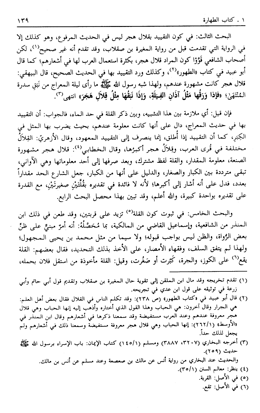 الْبَحْثُ الثَّالِثُ: فِي كَوَّنَ التَّقْيِيدِ بِقِلَالِ هَجَرَ لَيْسَ فِي الْحَدِيثِ الْمَرْفُوعِ وَهُوَ كَذَلِكَ إلَّا فِي الرِّوَايَةِ الَّتِي تَقَدَّمَتْ قَبْلُ مِنْ رِوَايَةِ الْمُغِيرَةِ بْنِ صقلاب وَقَدْ تَقَدَّمَ أَنَّهُ غَيْرُ صَحِيحٍ1 لَكِنَّ أَصْحَابَ الشَّافِعِيِّ قووا كون الْمُرَادَ قِلَالُ هَجَرَ بِكَثْرَةِ اسْتِعْمَالِ الْعَرَبِ لَهَا فِي أَشْعَارِهِمْ كَمَا قَالَ أَبُو عُبَيْدٍ فِي كِتَابِ الطَّهُورِ2 وَكَذَلِكَ وَرَدَ التَّقْيِيدُ بِهَا فِي الْحَدِيثِ الصَّحِيحِ قَالَ الْبَيْهَقِيُّ قِلَالُ هَجَرَ كَانَتْ مَشْهُورَةً عِنْدَهُمْ وَلِهَذَا شَبَّهَ رَسُولُ اللَّهِ صَلَّى اللَّهُ عَلَيْهِ وَسَلَّمَ مَا رَأَى لَيْلَةَ الْمِعْرَاجِ مِنْ نَبْقِ سِدْرَةِ الْمُنْتَهَى "فَإِذَا وَرَقُهَا مِثْلُ آذَانِ الْفِيلَةِ وَإِذَا نَبْقُهَا مِثْلُ قِلَالِ هَجَرَ" انْتَهَى3.