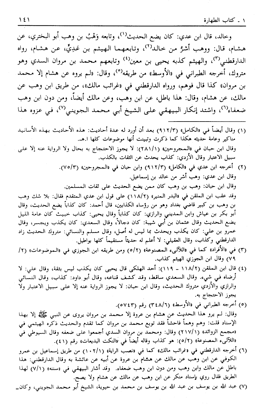 وقد عقب ابن الملقن في "البدر المنير" "2/118" على قول ابن عدي المتقدم فقال: بلا شك وهب بن وهب بن كبير قاضي بغداد وهو من رؤساء الكذابين، قال أحمد: كان كذاباً يضع الحديث، وقال أبو بكر بن عياش وابن المديني والرازي: كان كذاباً وقال يحيى: كذاب خبيث كان عامة الليل يضع الحديث وقال عثمان بن أبي شيبة: كان دجالاً، وقال السعدي: كان يكذب ويجسر، وقال عمرو بن علي: كان يكذب ويحدث بما ليس له أصل، وقال مسلم والنسائي: متروك الحديث زاد الدارقطني وكذاب، وقال العقيلي: لا أعلم له حديثاً مستقيماً كلها بواطيل.