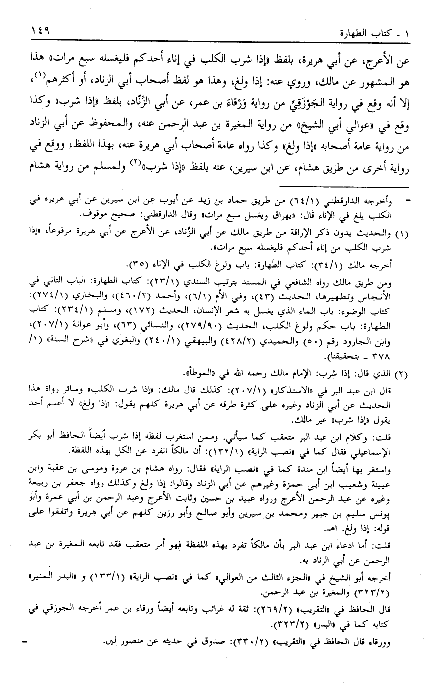 عَنْ الْأَعْرَجِ، عَنْ أَبِي هُرَيْرَةَ بِلَفْظِ إذَا شَرِبَ الْكَلْبُ فِي إنَاءِ أَحَدِكُمْ فَلْيَغْسِلْهُ سَبْعَ مَرَّاتٍ هَذَا هُوَ الْمَشْهُورُ عَنْ مَالِك وَرُوِيَ عَنْهُ إذَا وَلَغَ وَهَذَا هُوَ لَفْظُ أَصْحَابِ أَبِي الزِّنَادِ أَوْ أَكْثَرِهِمْ1 إلَّا أَنَّهُ وَقَعَ فِي رِوَايَةِ الْجَوْزَقِيِّ مِنْ رِوَايَةِ وَرْقَاءَ بْنِ عُمَرَ عَنْ أَبِي الزِّنَادِ بِلَفْظِ "إذَا شَرِبَ" وَكَذَا وَقَعَ فِي عَوَالِي أَبِي الشَّيْخِ مِنْ رِوَايَةِ الْمُغِيرَةِ بْنِ عَبْدِ الرَّحْمَنِ عَنْهُ وَالْمَحْفُوظُ عَنْ أَبِي الزِّنَادِ مِنْ رِوَايَةِ عَامَّةِ أَصْحَابِهِ "إذَا وَلَغَ" وَكَذَا رَوَاهُ عَامَّةُ أَصْحَابِ أَبِي هُرَيْرَةَ عَنْهُ بِهَذَا اللَّفْظِ وَوَقَعَ فِي رِوَايَةٍ أُخْرَى مِنْ طَرِيقِ هِشَامٍ عَنْ بن سيرين عَنْهُ بِلَفْظِ "إذَا شَرِبَ" 2 وَلِمُسْلِمٍ مِنْ رِوَايَةِ هِشَامٍ