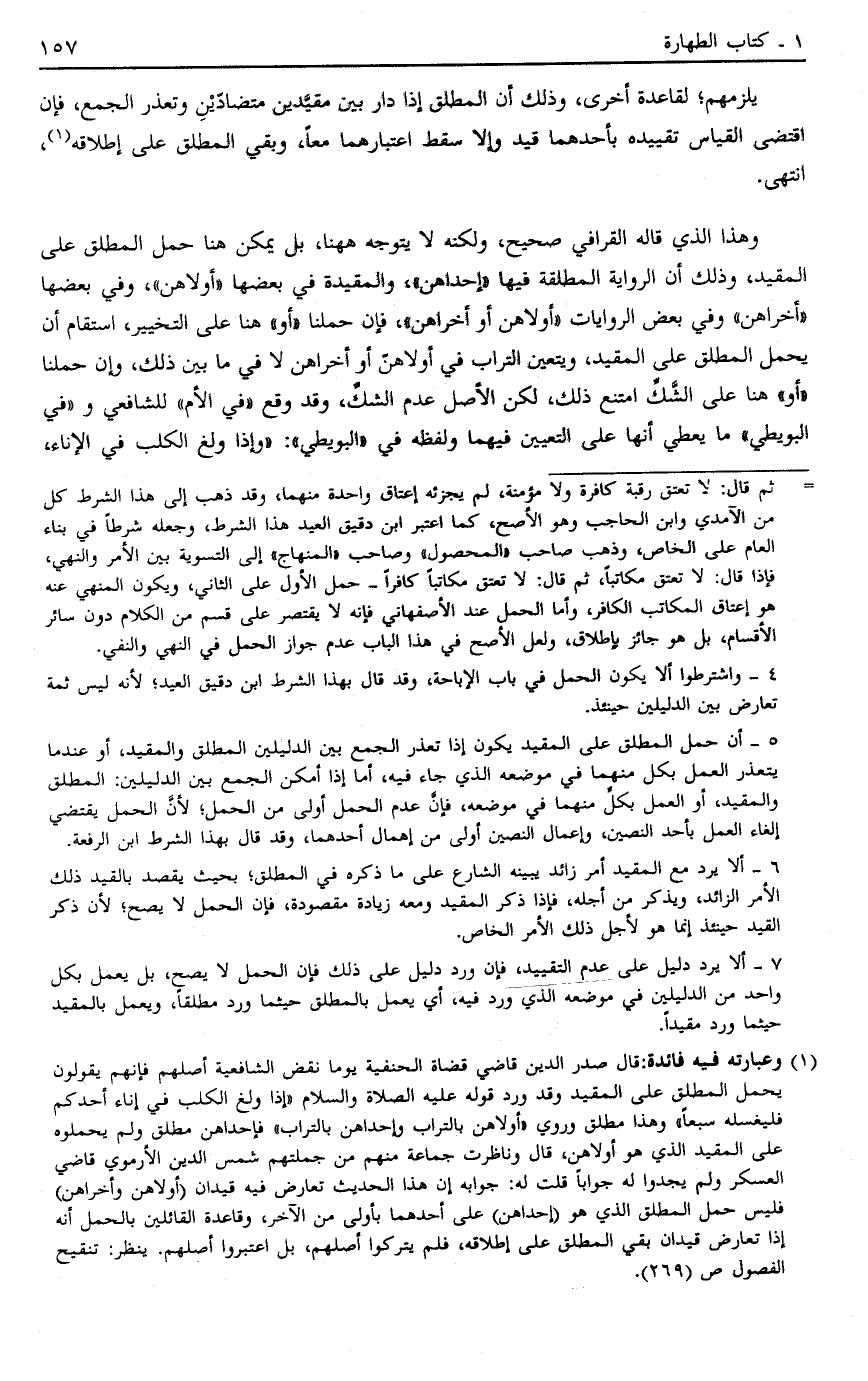 1 وعبارته فيه فائدة: قال صدر الدين قاضي قضاة الحنفية يوما نقض الشافعية أصلهم فإنهم يقولون يحمل المطلق على المقيد وقد ورد قوله عليه الصلاة والسلام: "إذا ولغ الكلب في إناء أحدكم فليغسله سبعاً" وهذا مطلق وروي "أولاًهن بالتراب وإحداهن بالتراب" فإحداهن مطلق ولم يحملوه على المقيد الذي هو أولاهن، قال وناظرت جماعة منهم من جملتهم شمس الدين الأرموي قاضي العسكر ولم يجدوا له جواباً قلت له: جوابه إن هذا الحديث تعارض فيه قيدان "أولاهن وأخراهن " فليس حمل المطلق الذي هو "إحداهن" على أحدهما بأولى من الآخر، وقاعدة القائلين بالحمل أنه إذا تعارض قيدان بقي المطلق على إطلاقه، فلم يتركوا أصلهم، بل اعتبروا أصلهم. ينظر: تنقيح الفصول ص "269".