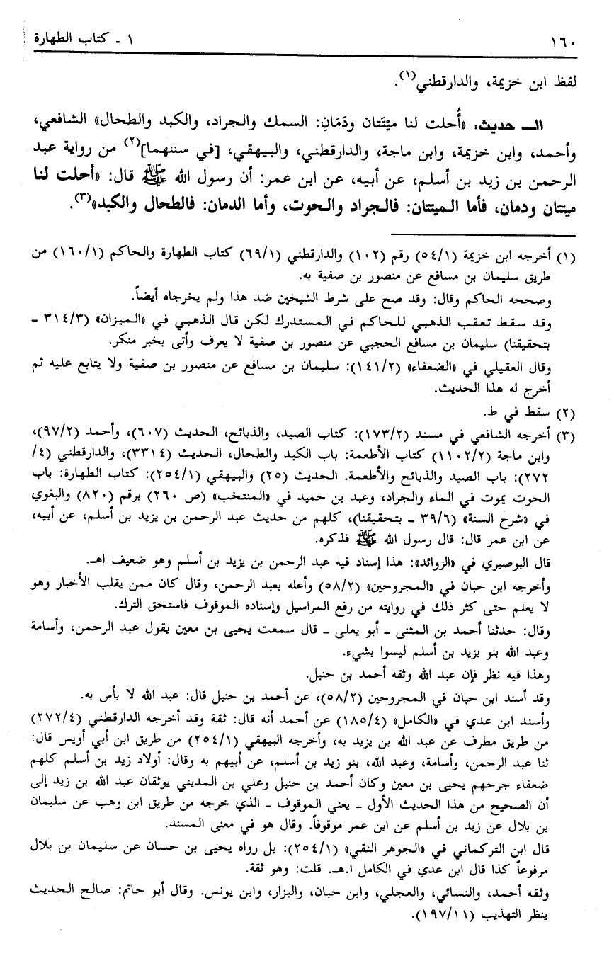 11 - حَدِيثُ "أُحِلَّتْ لَنَا مَيْتَتَانِ وَدَمَانِ السَّمَكُ وَالْجَرَادُ وَالْكَبِدُ وَالطِّحَالُ" الشَّافِعِيُّ وَأَحْمَدُ وَابْنُ مَاجَهْ والدارقطني والبيهقي [في سننهما] 2 مِنْ رِوَايَةِ عَبْدِ الرَّحْمَنِ بْنِ زَيْدِ بْنِ أَسْلَمَ عَنْ أَبِيهِ عَنْ ابْنِ عُمَرَ أَنَّ رَسُولَ اللَّهِ صَلَّى اللَّهُ عَلَيْهِ وَسَلَّمَ قَالَ: "أُحِلَّتْ لَنَا مَيْتَتَانِ وَدَمَانِ فَأَمَّا الْمَيْتَتَانِ فَالْجَرَادُ وَالْحُوتُ وَأَمَّا الدَّمَانِ فَالطِّحَالُ وَالْكَبِدُ" 3.