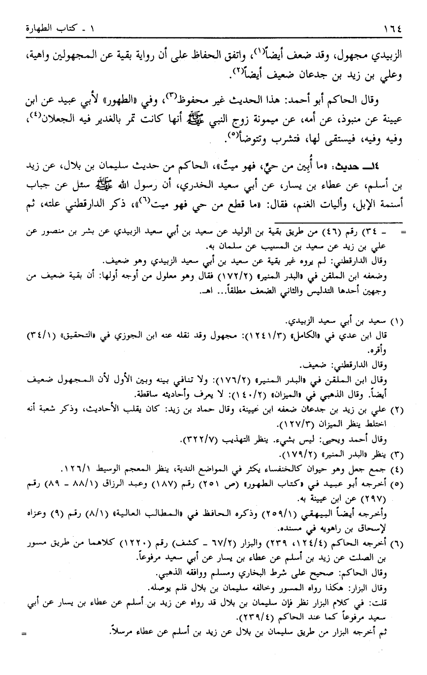 14 - حَدِيثُ "مَا أُبِينَ مِنْ حَيٍّ فَهُوَ مَيِّتٌ" الْحَاكِمُ مِنْ حَدِيثِ سُلَيْمَانَ بْنِ بِلَالٍ عَنْ زَيْدِ بْنِ أَسْلَمَ عَنْ عَطَاءِ بْنِ يَسَارٍ عَنْ أَبِي سَعِيدٍ الْخُدْرِيِّ أَنَّ رَسُولَ اللَّهِ صَلَّى اللَّهُ عَلَيْهِ وَسَلَّمَ سُئِلَ عَنْ جِبَابِ أَسْنِمَةِ الْإِبِلِ وَأَلْيَاتِ الْغَنَمِ فَقَالَ: "مَا قُطِعَ مِنْ حَيٍّ فَهُوَ مَيِّتٌ" 6 ذَكَرَ الدَّارَقُطْنِيُّ عِلَّتَهُ ثُمَّ