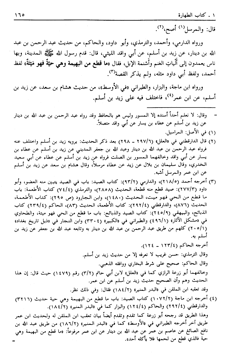 3 أخرجه أحمد "5/218"، والدارمي "2/93": كتاب الصيد: باب في الصيد تبين منه العضو، وأبو داود "3/277": صيد قطع منه قطعة، الحديث "2858"، والترمذي "4/74" كتاب الأطعمة ة باب ما قطع من الحي فهو ميت، الحديث "1480"، وابن الجارود "ص 295": كتاب الأطعمة، الحديث "876"، والدارقطني "4/292": كتاب الأطعمة، الحديث "83"، الحاكم "4/239" كتاب الذبائح، والبيهقي "9/245": كتاب الصيد والذبائح: باب ما قطع من الحي فهو ميتة، والطحاوي في "مشكل الآثار" "1/496" والطبراني في "الكبير" "3304" وابن النجار في "ذيل تاريخ بغداد" "1/205" كلهم من طريق عبد الرحمن بن عبد الله بن دينار به وتابعه عبد الله بن جعفر عن زيد بن أسلم به.