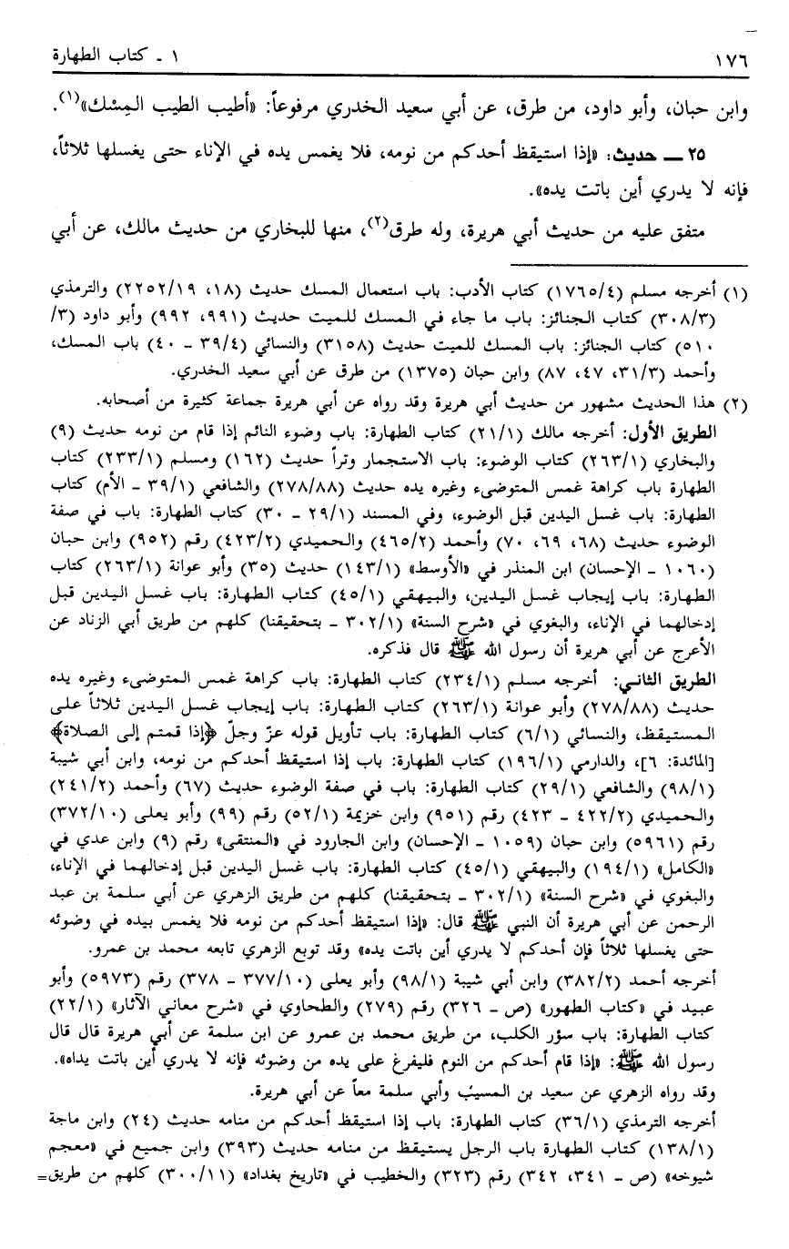 25 - حَدِيثُ "إذَا اسْتَيْقَظَ أَحَدُكُمْ مِنْ نَوْمِهِ فَلَا يَغْمِسْ يَدَهُ فِي الْإِنَاءِ حَتَّى يَغْسِلَهَا ثَلَاثًا فَإِنَّهُ لَا يَدْرِي أَيْنَ بَاتَتْ يَدُهُ".