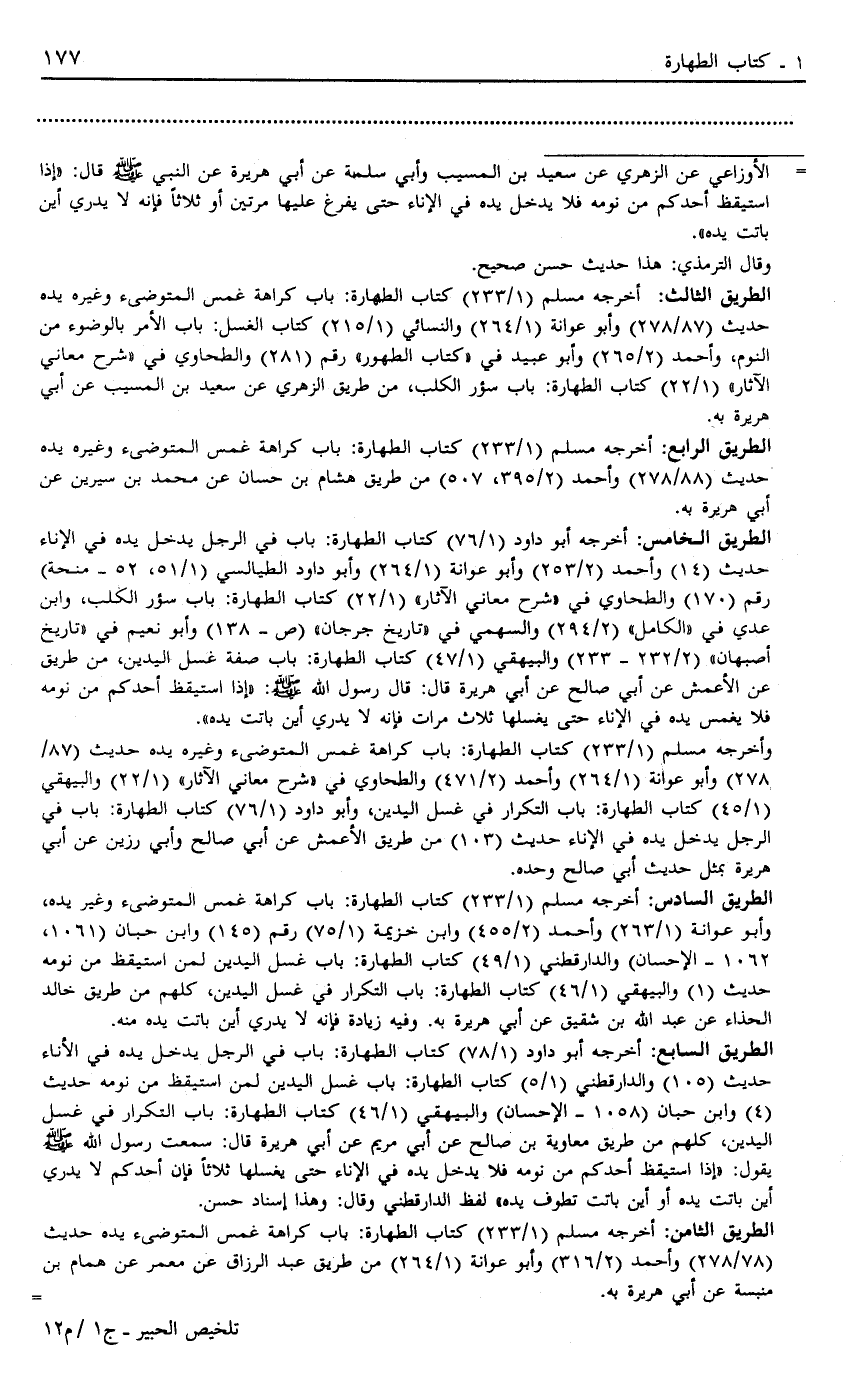 الطريق السابع: أخرجه أبو داود "1/78" كتاب الطهارة: باب في الرجل يدخل يده في الإناء حديث "105" والدارقطني "1/5" كتاب الطهارة: باب غسل اليدين لمن استيقظ من نومه حديث "4" وابن حبان "1058- الإحسان" والبيهقي "1/46" كتاب الطهارة: باب التكرار في غسل اليدين، كلهم من طريق معاوية بن صالح عن أبي مريم عن أبي هريرة قال: سمعت رسول الله صلي الله عليه وسلم يقول: "إذا استيقظ أحدكم من نومه فلا يدخل يده في الإناء حتى يغسلها ثلاثاً فإن أحدكم لا يدري أين باتت يده أو أين باتت تطوف يده" لفظ الدارقطني وقال: وهذا إسناد حسن.