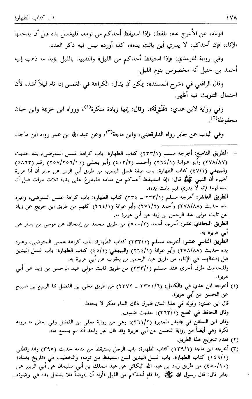 الزِّنَادِ عَنْ الْأَعْرَجِ عَنْهُ بِلَفْظِ: "إذَا اسْتَيْقَظَ أَحَدُكُمْ مِنْ نَوْمِهِ فَلْيَغْسِلْ يَدَهُ قَبْلَ أَنْ يُدْخِلَهَا الْإِنَاءَ فَإِنَّ أَحَدَكُمْ لَا يَدْرِي أَيْنَ بَاتَتْ يَدُهُ" كَذَا أَوْرَدَهُ لَيْسَ فِيهِ ذِكْرُ الْعَدَدِ.