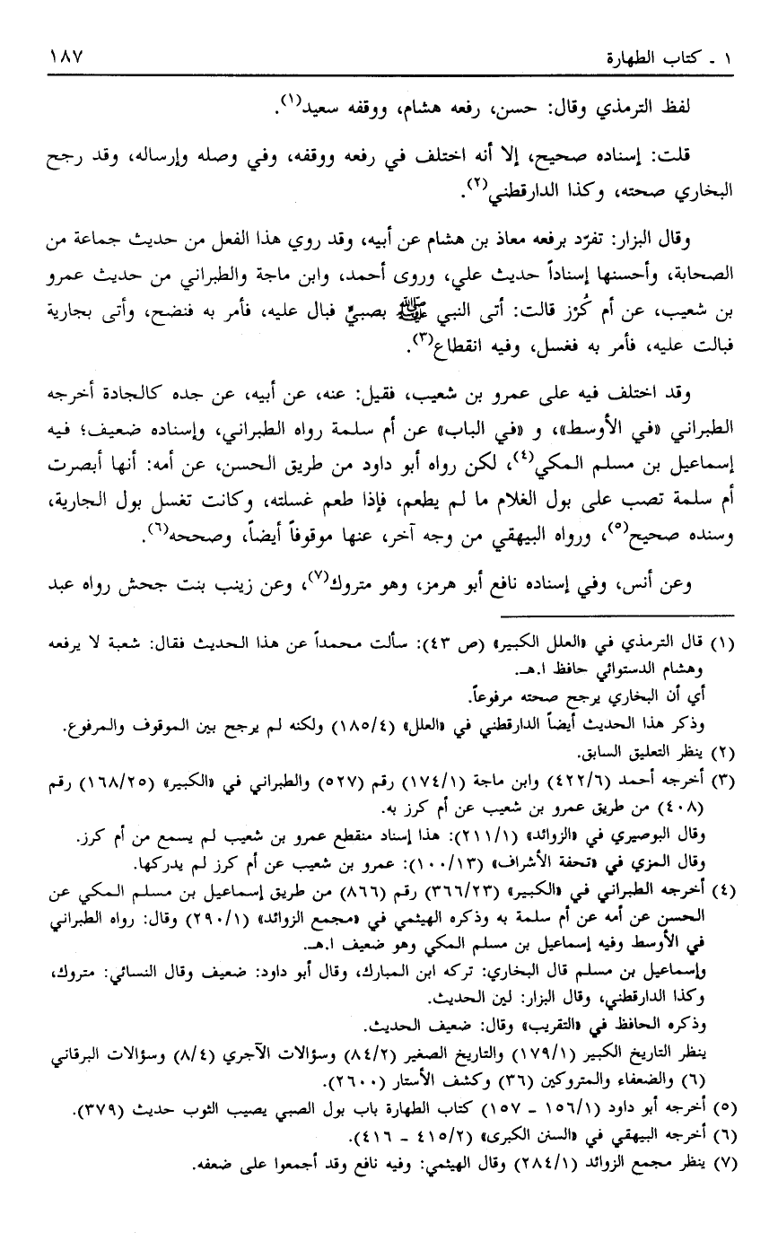وَقَالَ الْبَزَّارُ: تَفَرَّدَ بِرَفْعِهِ مُعَاذُ بْنُ هِشَامٍ عَنْ أَبِيهِ وَقَدْ رُوِيَ هَذَا الْفِعْلُ مِنْ حَدِيثِ جَمَاعَةٍ مِنْ الصَّحَابَةِ وَأَحْسَنُهَا إسْنَادًا حَدِيثُ عَلِيٍّ وَرَوَى أَحْمَدُ وَابْنُ مَاجَهْ وَالطَّبَرَانِيُّ مِنْ حَدِيثِ عَمْرِو بْنِ شُعَيْبٍ عَنْ أُمِّ كُرْزٍ قَالَتْ أُتِيَ النَّبِيُّ صَلَّى اللَّهُ عَلَيْهِ وَسَلَّمَ بِصَبِيٍّ فَبَالَ عَلَيْهِ فَأَمَرَ بِهِ فَنُضِحَ وَأُتِيَ بِجَارِيَةٍ فَبَالَتْ عَلَيْهِ فَأَمَرَ بِهِ فَغُسِلَ وَفِيهِ انْقِطَاعٌ3.