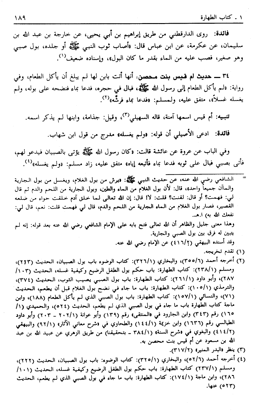 34 - حَدِيثُ أُمِّ قَيْسٍ بِنْتِ مِحْصَنٍ أَنَّهَا أَتَتْ بِابْنٍ لَهَا لَمْ يَبْلُغْ أَنْ يَأْكُلَ الطَّعَامَ وَفِي رِوَايَةٍ لَمْ يَأْكُلْ الطَّعَامَ إلَى رَسُولِ اللَّهِ صَلَّى اللَّهُ عَلَيْهِ وَسَلَّمَ فَبَالَ فِي حَجْرِهِ فَدَعَا بِمَاءٍ فَنَضَحَهُ عَلَى بَوْلِهِ وَلَمْ يَغْسِلْهُ غَسْلًا مُتَّفَقٌ عَلَيْهِ وَلِمُسْلِمٍ فَدَعَا بِمَاءٍ فَرَشَّهُ2.